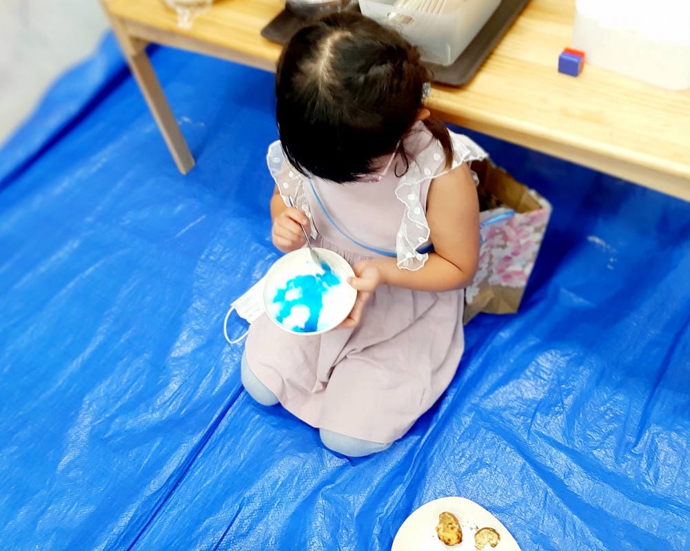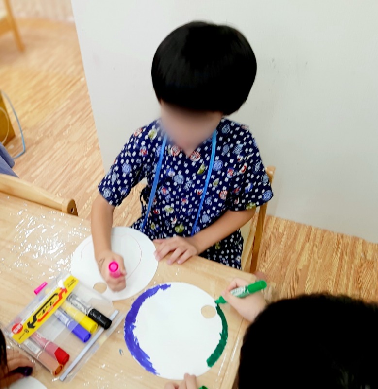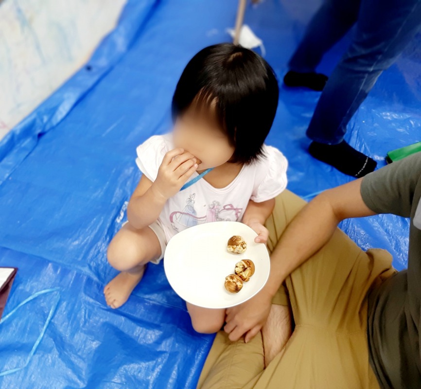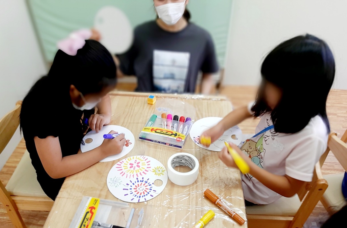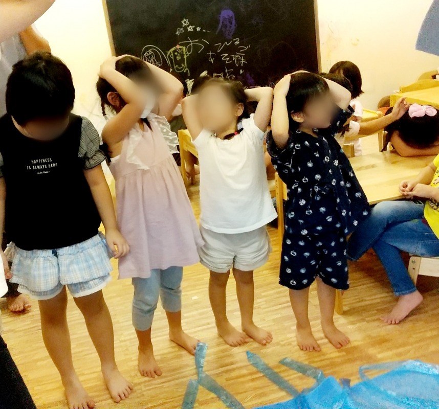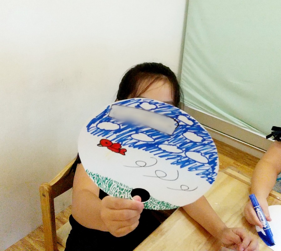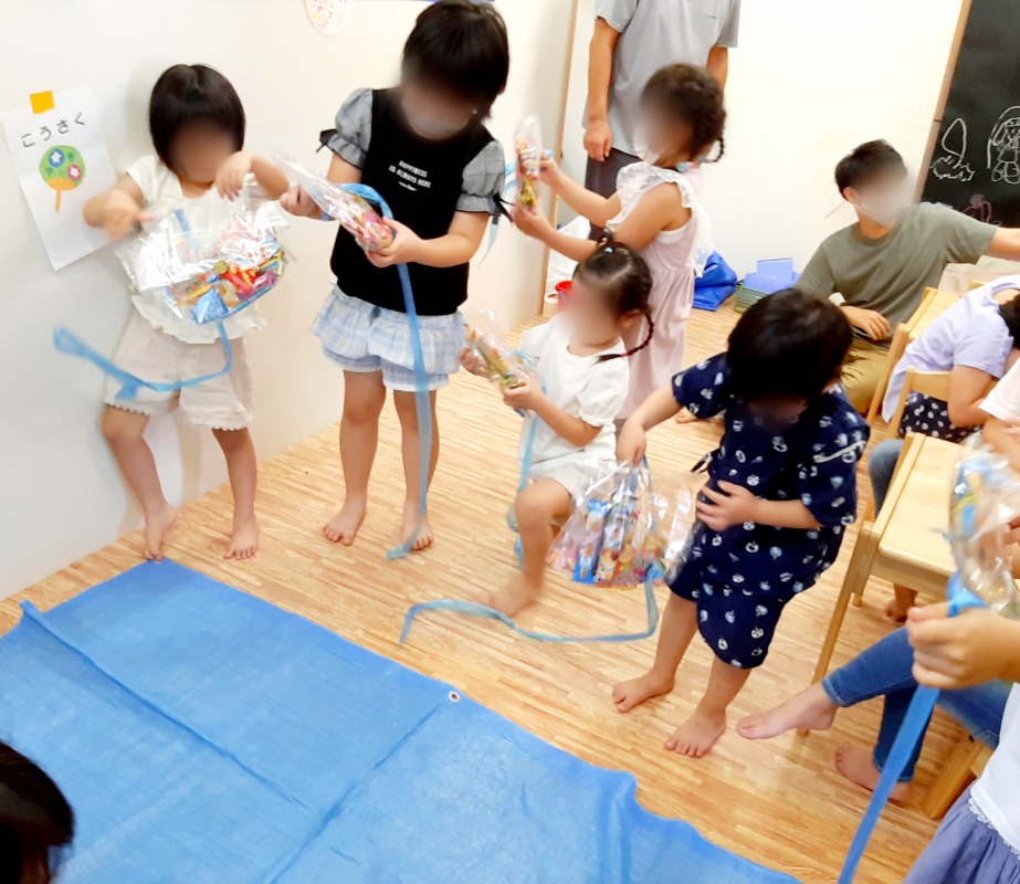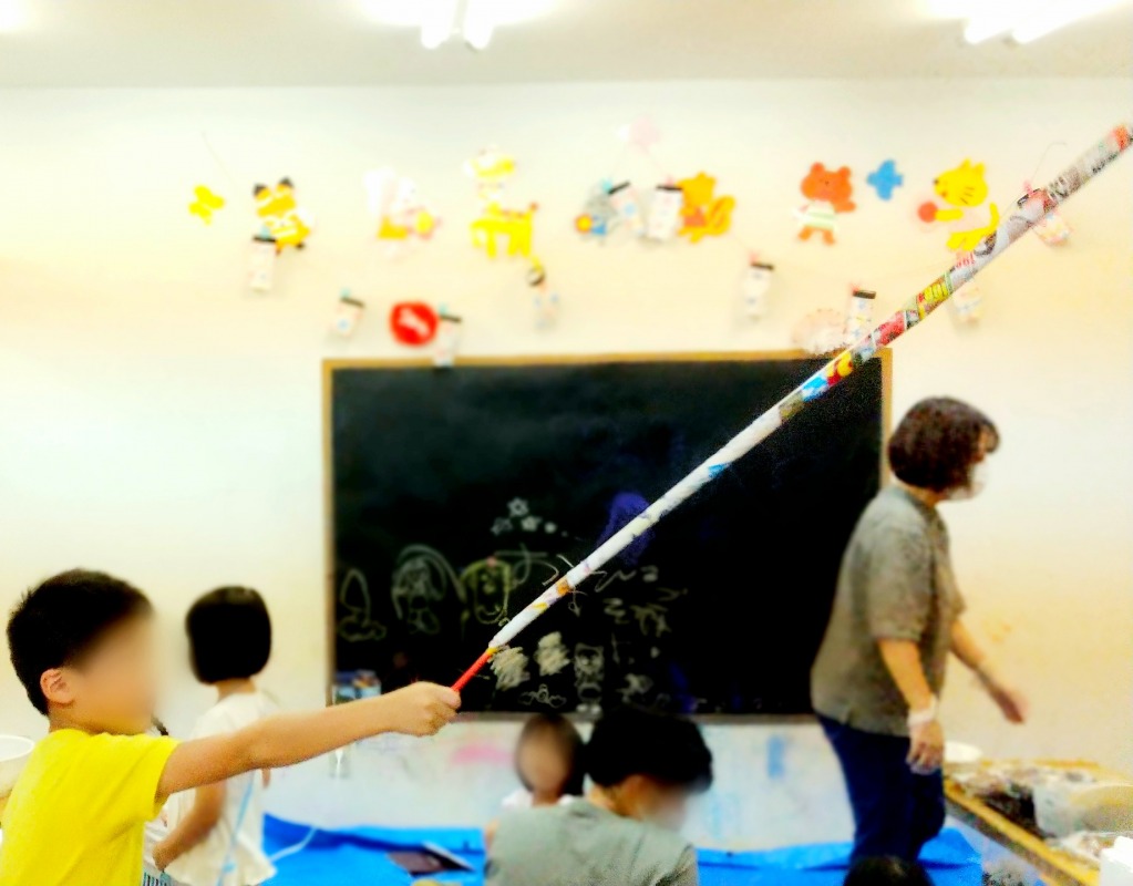 2021.8.29 夏祭り2 日々のこと 夏祭り第二部。如意棒作り。思った以上に伸びてびっくり!うちわ作り。何を描こうかな。夏らしい素敵なうちわができあがりました。たこ焼き…ではなく、串なしのアメリカンドッグです。やっぱりかき氷は大人気。そしてクライマックスは、お菓子のひも引きです。触りたい気持ちをがまんして、手を頭の上へ。スタート!無事にお菓子をゲットしました!もうすぐ夏も終わりです。楽しい思い出、たくさんできたかな?