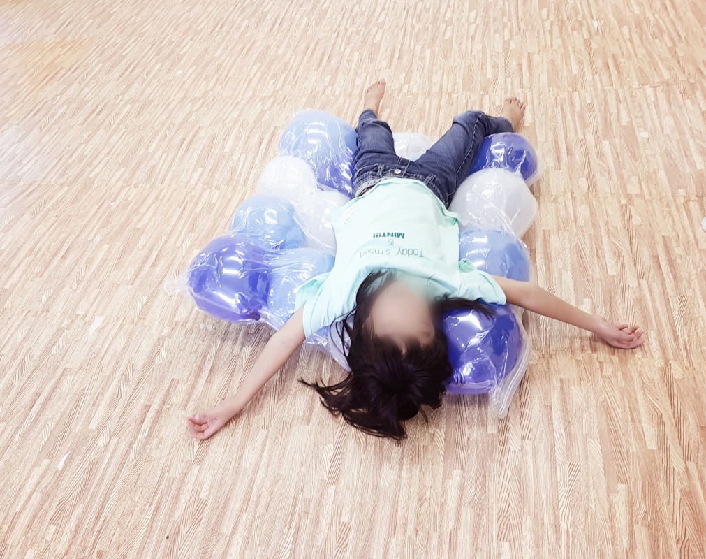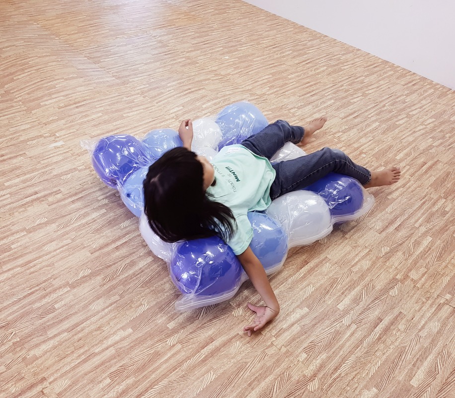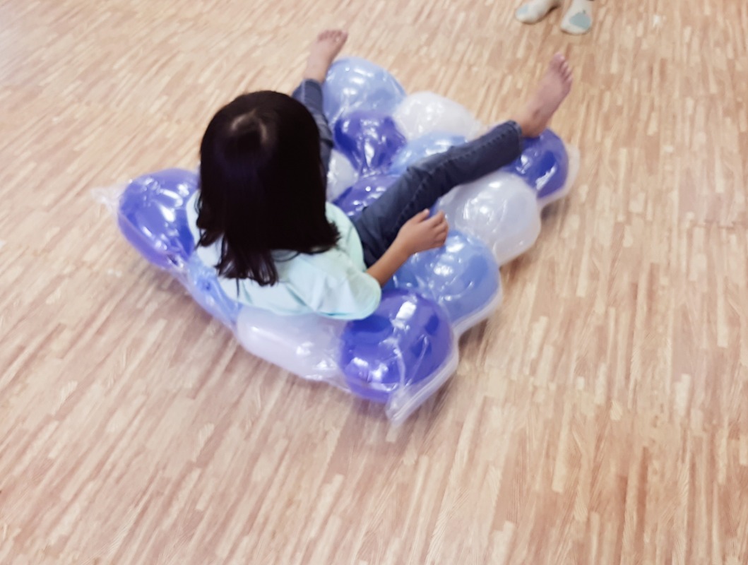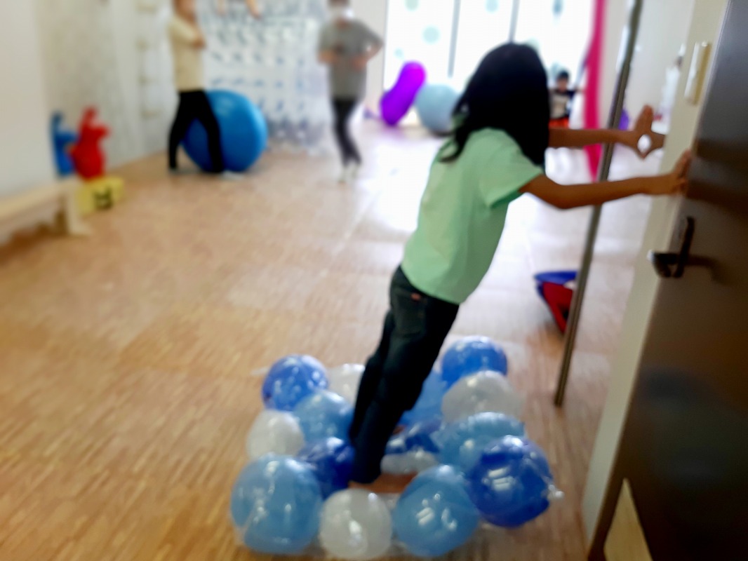 2021.9.1 バルーンマット 日々のこと バルーンマット。スタッフが作ってきてくれました。おそるおそる座ってみます。割れません!寝転がってみても、割れません。気持ち良さそう。立つこともできました。子どもたちは、ふわふわユラユラ不安定な感覚が大好き。楽しくあそびながら、平衡感覚を養っていきます。