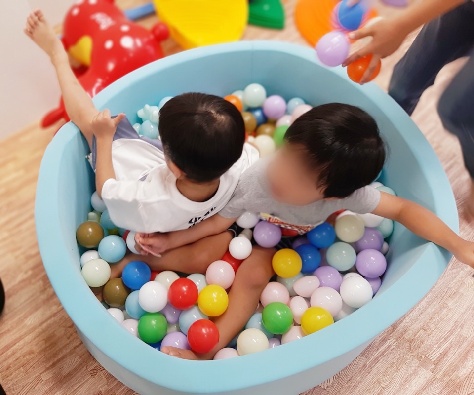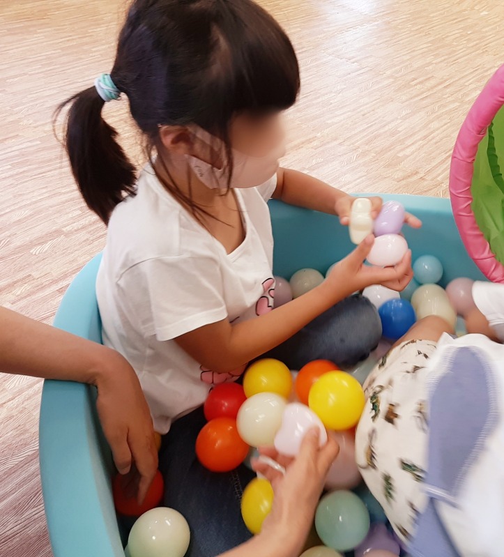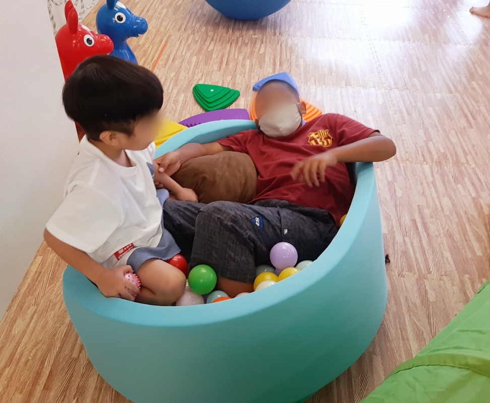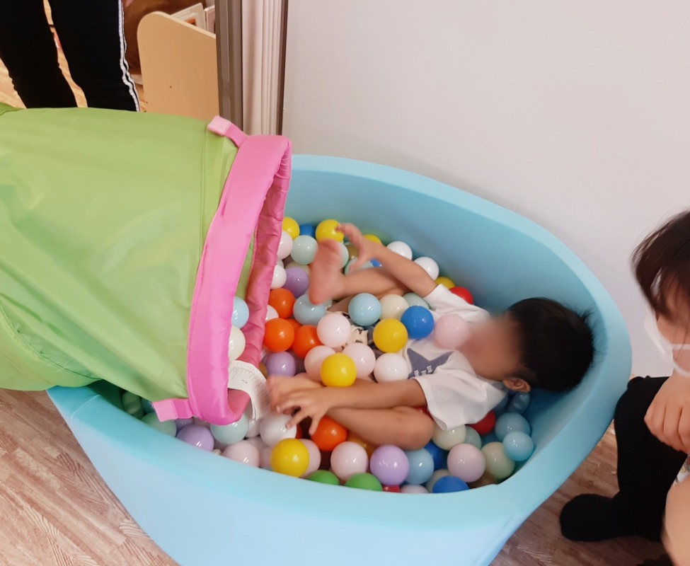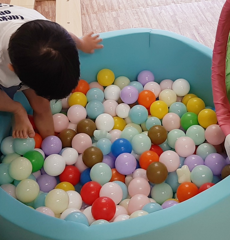 そんなわけで、楽しくあそびながら「識別系」が育つよう、ボールプールの中に、敢えて大きさや形のちがう物を入れてみました。