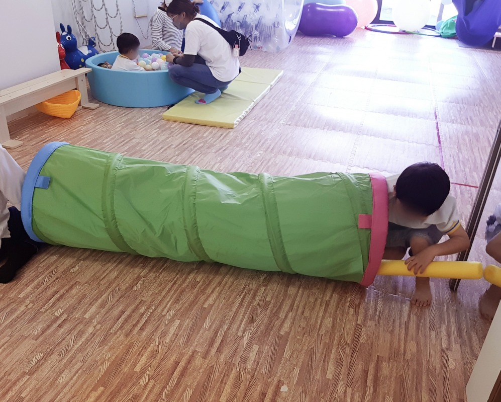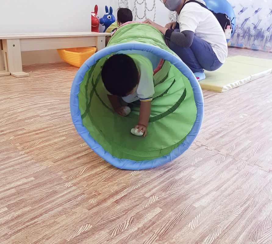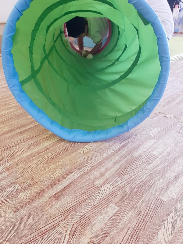 2021.9.9 トンネルであそぼう 日々のこと きのねに新しいトンネルもやってきました。よーし、くぐってみよう!無事くぐることができました。トンネルをくぐることで、自分の体のサイズや、手足・体の曲げ伸ばし具合を学び、ボディイメージを育てていくことができます。ハイハイの姿勢をとれるのもいいですね。こんなあそびも楽しんでいましたよ。