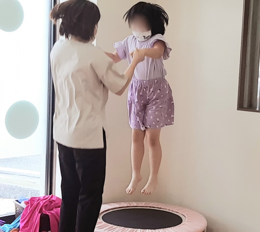 2021.9.17 トランポリン☆ジャンプ! 日々のこと 大好きなスタッフと一緒に、トランポリンでジャンプ!以前より、ずいぶん高くジャンプできるようになり、軸もしっかりしてきました。「楽しい!」「もっとやりたい!」この気持ちが、確かな発達に繋がっていきます。