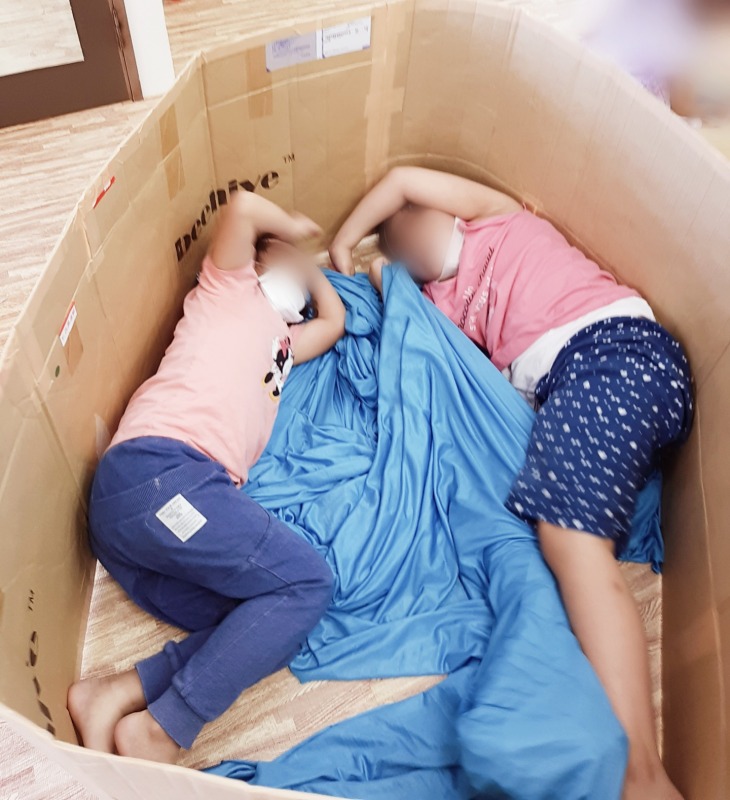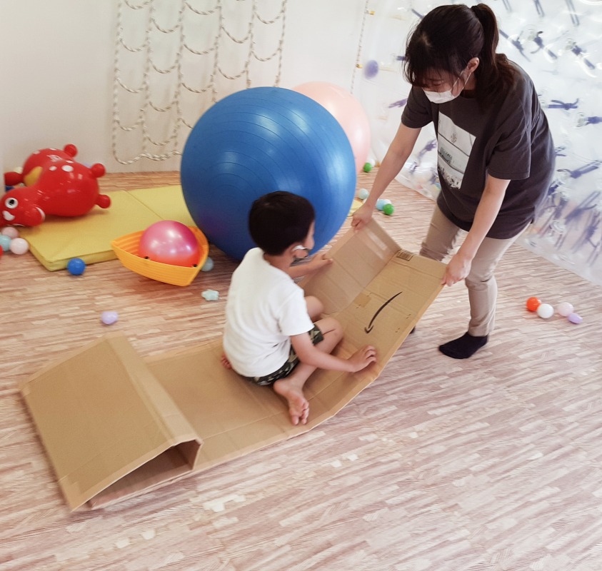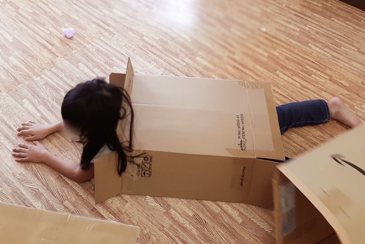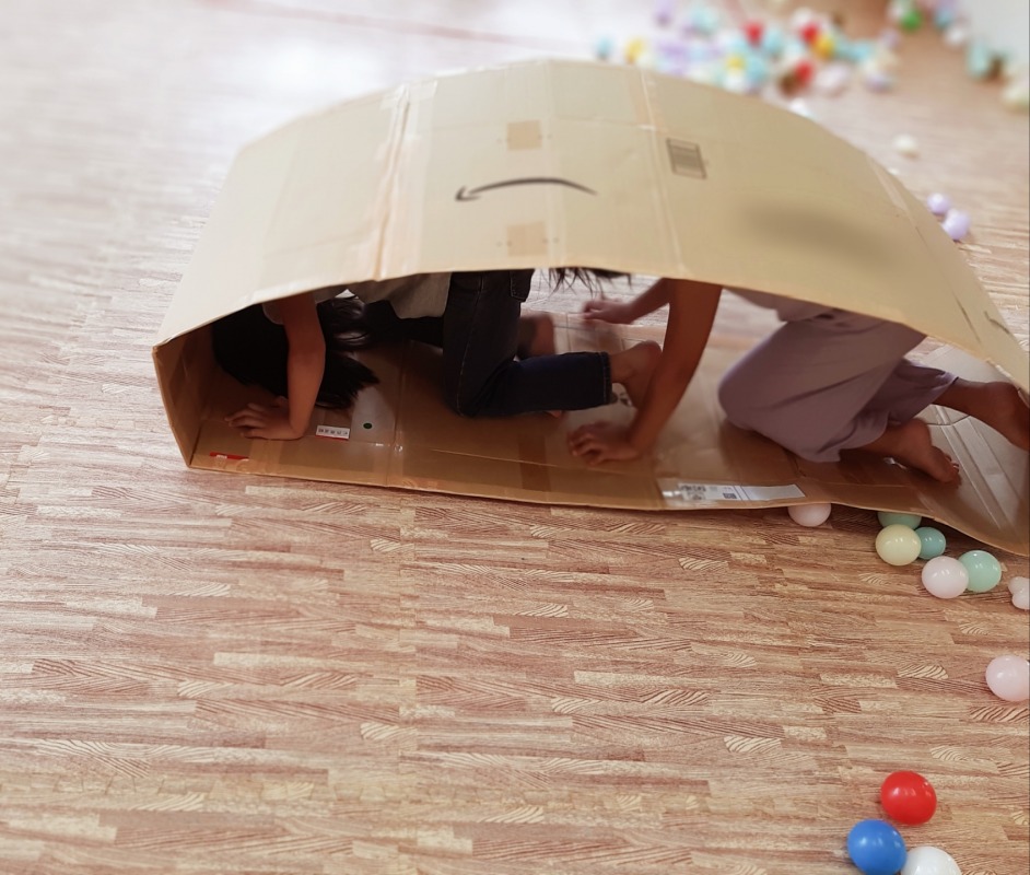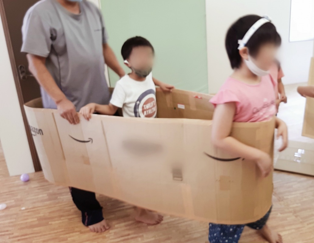 ダンボールをたくさん出しておくと、いろいろなあそびが始まりました。