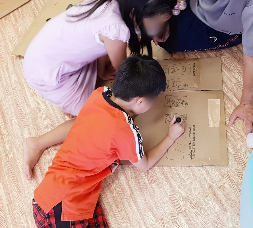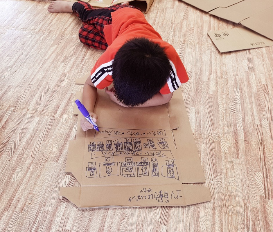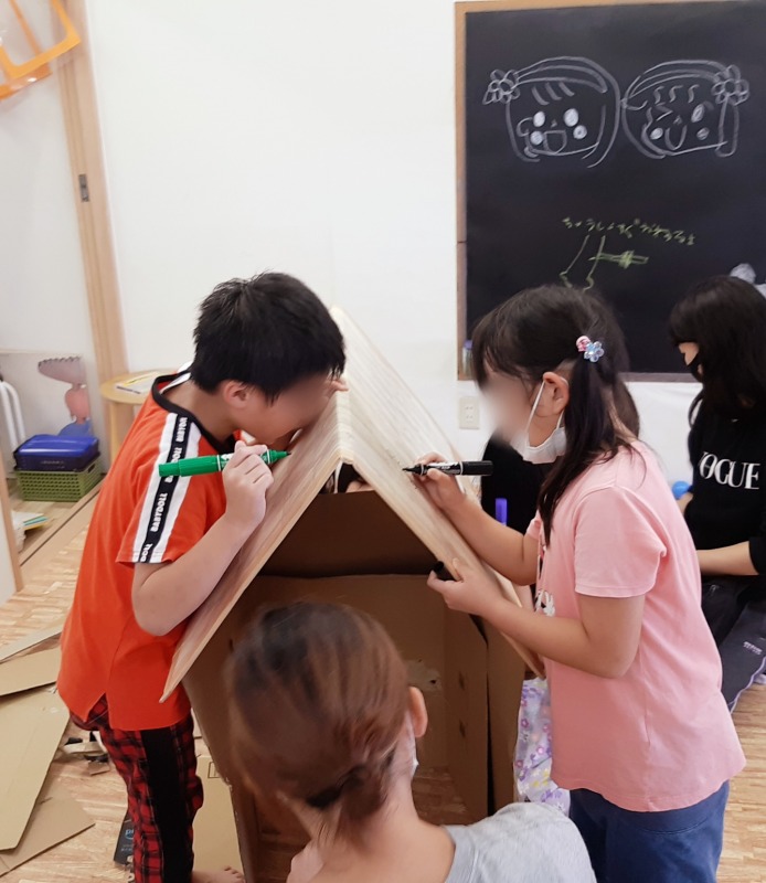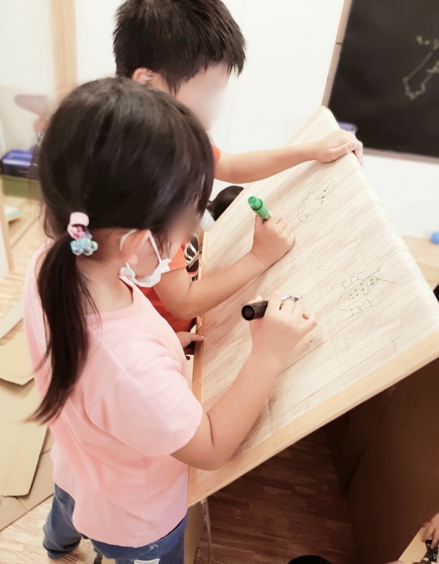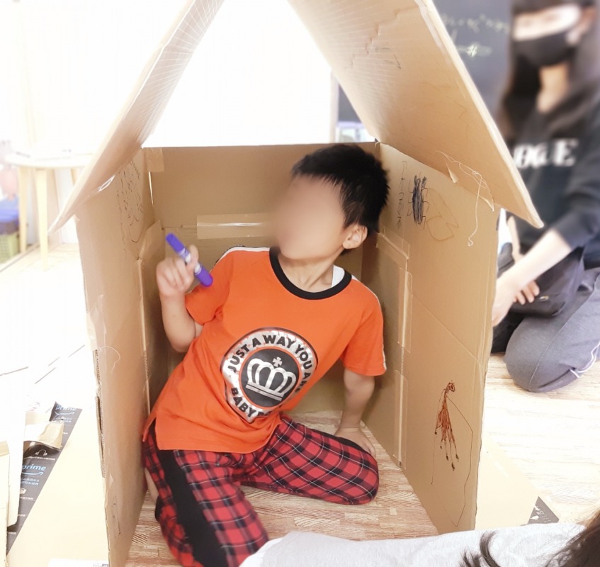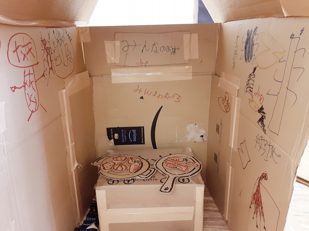 ダンボールやマジック、キャタピラなどの素材を用意しておいたら始まったあそびの数々。