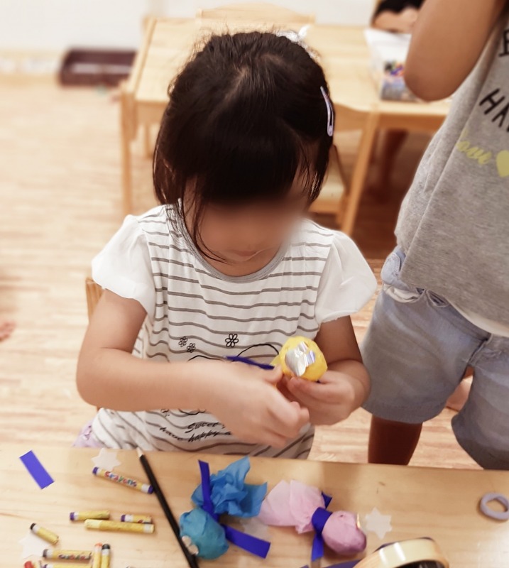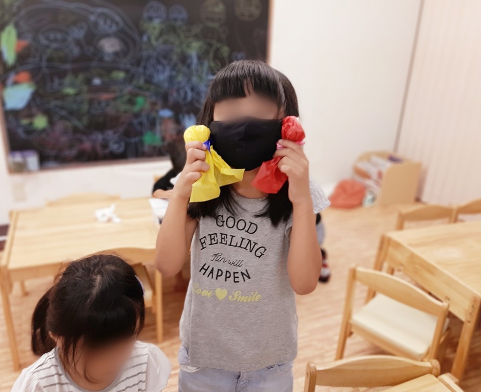 2021.9.30 カラフル人形 日々のこと 静かなあそびの時間。何やら真剣に作っています。お花紙やリボンを使ってカラフルな人形を作っています。できた、見て見て!女の子数人で同じ物を作り、とっても盛り上がっていました。