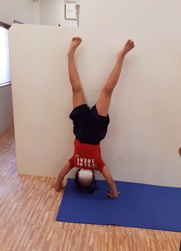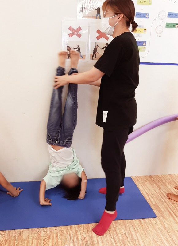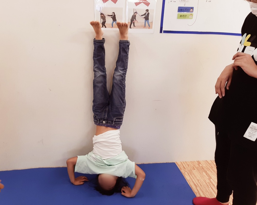 2021.10.7 逆立ちしよう 日々のこと 逆立ちに挑戦。腕の力でしっかり支えています。以前、一生懸命練習したことでかなり上達しました。初めて逆立ちに挑戦!身体の軸をまっすぐに立て直し、支えることができました。友だちがやるのを見て、挑戦しようという意欲が育ちます。