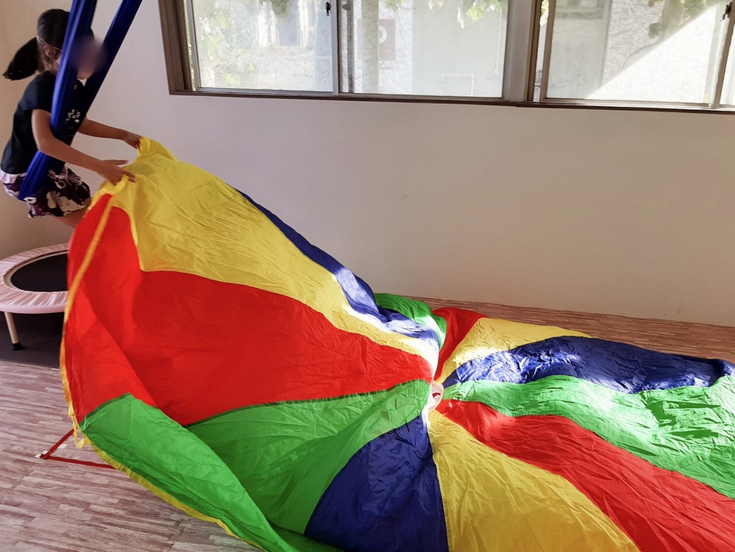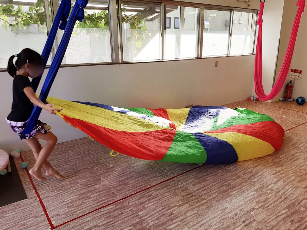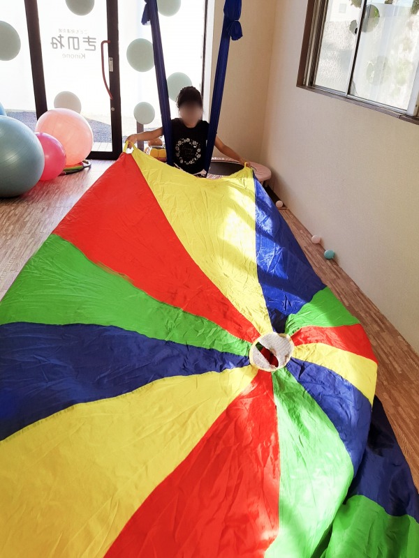 パラバルーンを持ちながらハンモックに乗って揺れると…