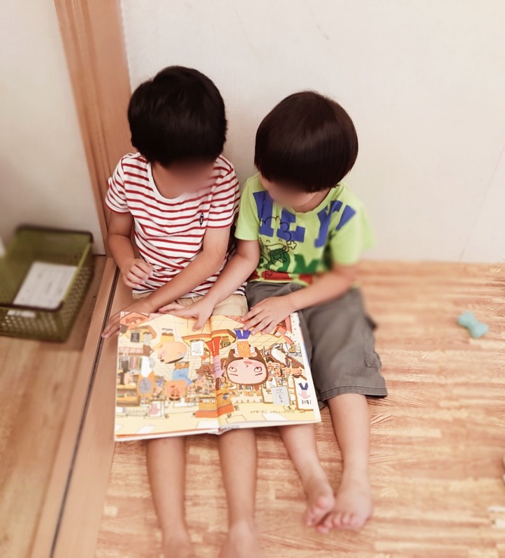 二人で仲良く絵本を見ています。