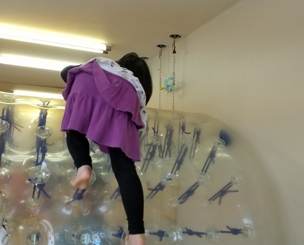 中に入ってぐるぐる回るのも楽しいけど、上にのぼってマットへ向かってジャンプするあそびが大人気。