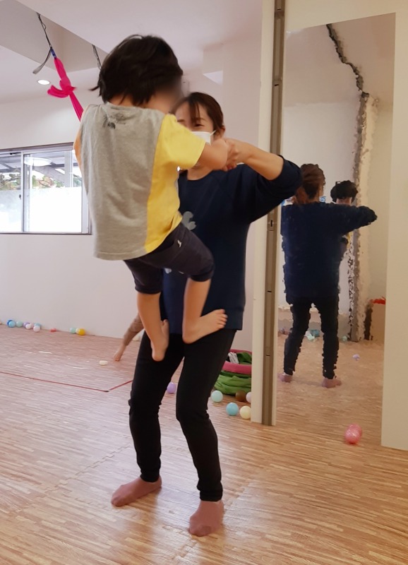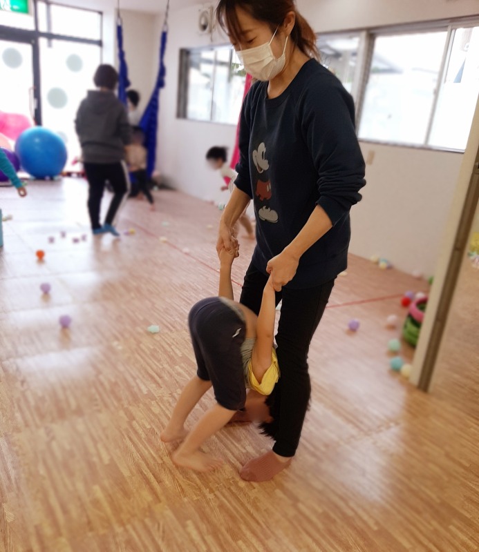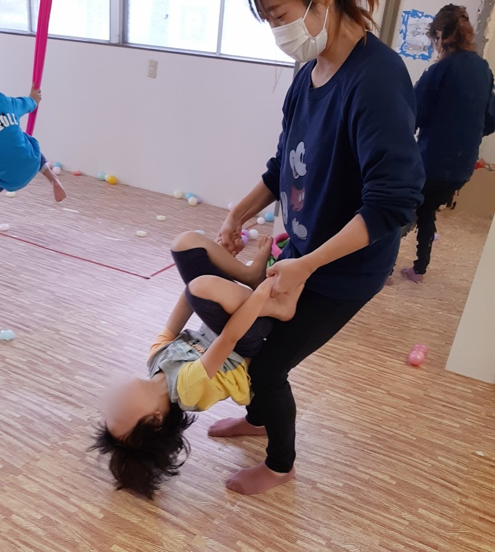 2021.11.1 ぐるりんぱ 日々のこと 上手に自分の身体を支えながらバランスをとっています。次はぐるりんぱ!とっても上手に回れました。身体を使ったスタッフとのふれあいあそびは、感覚の基礎となる前庭覚や固有覚にアプローチできるだけでなく、触覚のつまずきにもアプローチして、共感性を育てていきます。
