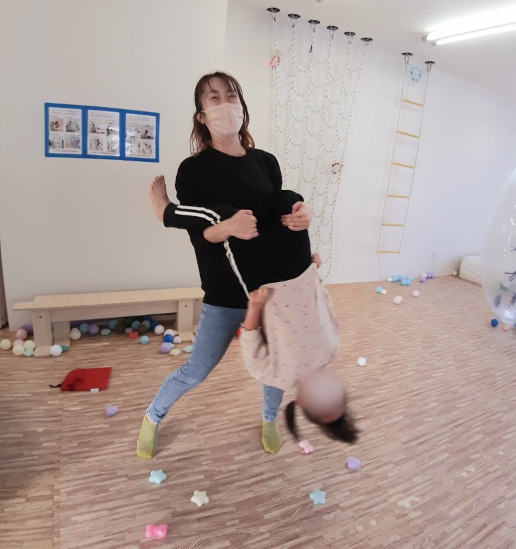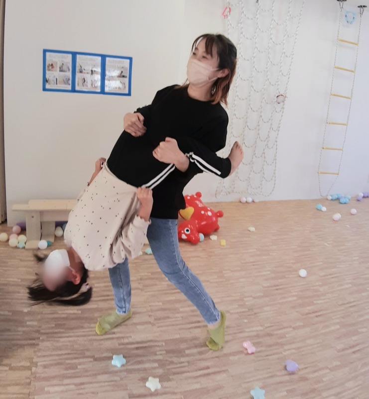 2021.11.5 ふれあいあそび 日々のこと スタッフとのふれあいあそびも大切な発達支援です。時にはこんなダイナミックなこともしてしまいます!子どもは大喜び!スタッフはヘトヘトですが、子どもたちのためにがんばります。楽しみながら、様々な感覚情報を入力していき、発達に繋げていきます。