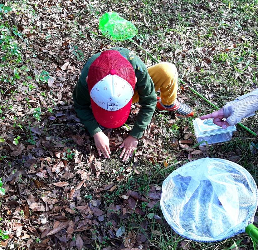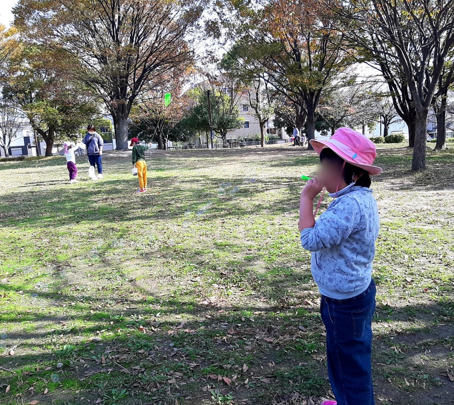 2021.11.6 前高公園 日々のこと 今日は近所の前高公園にあそびに行きました。自分で好きなあそびを選べるよう、シャボン玉、なわとび、ボール、たも、虫かごを持っていきました!みんな自分で選んだあそびを、思い思いに楽しんでいました。