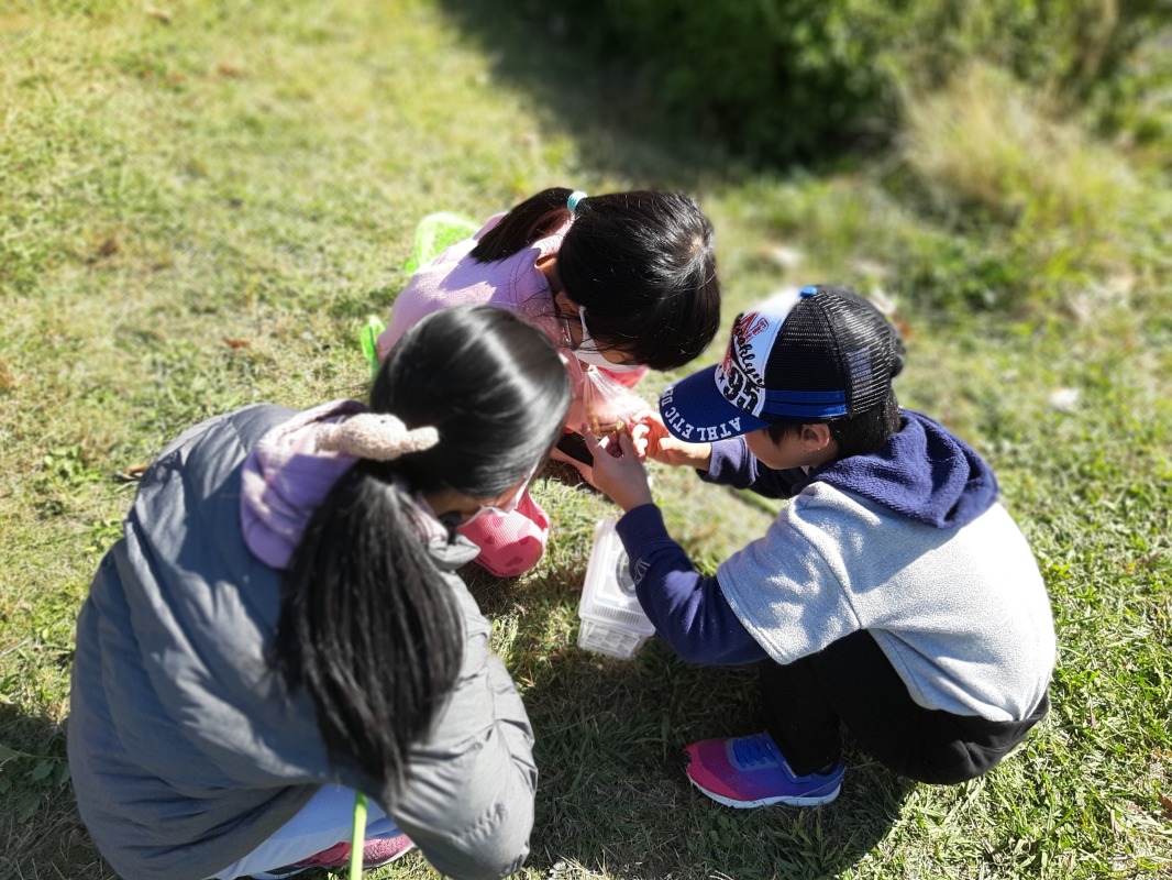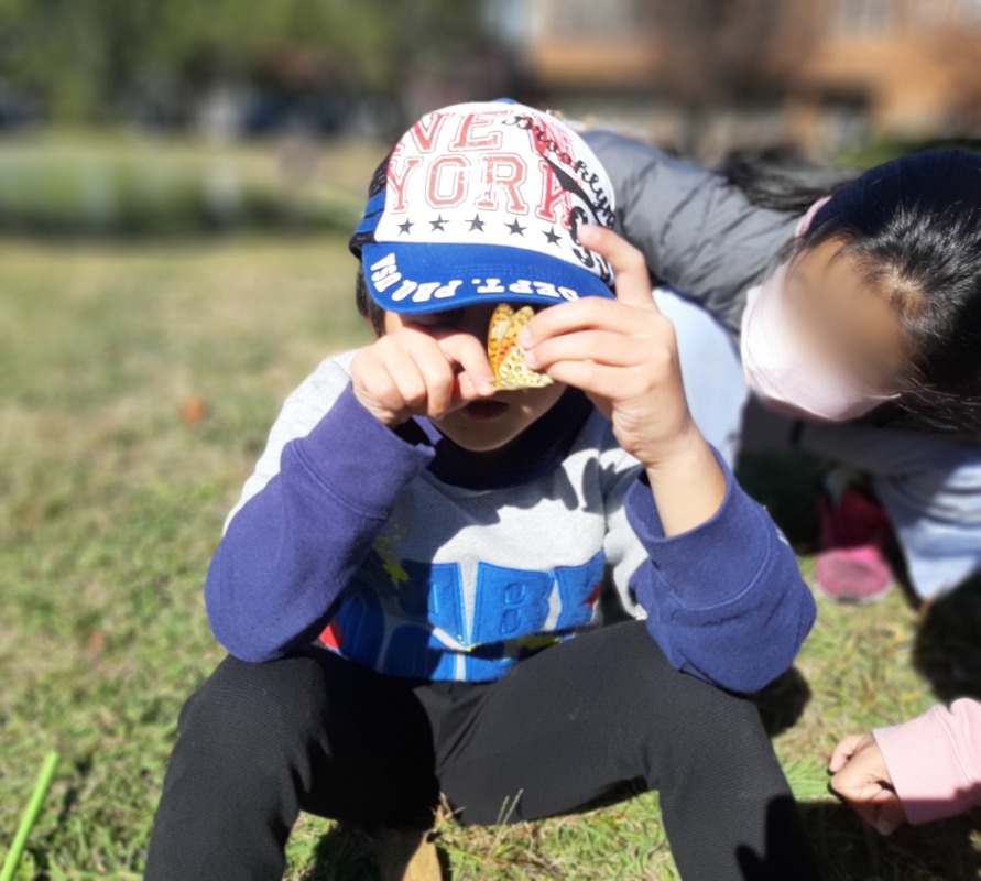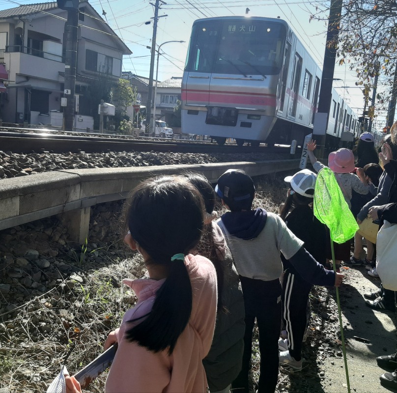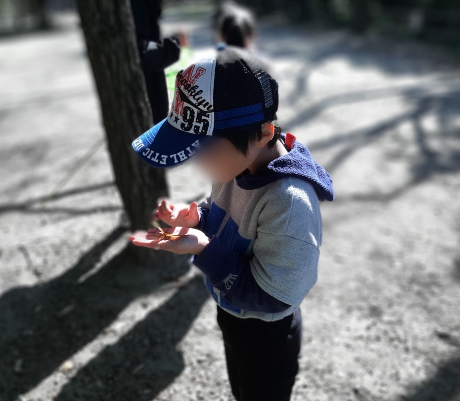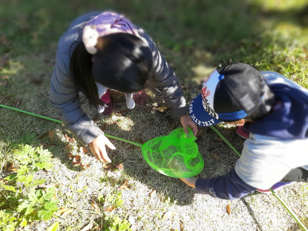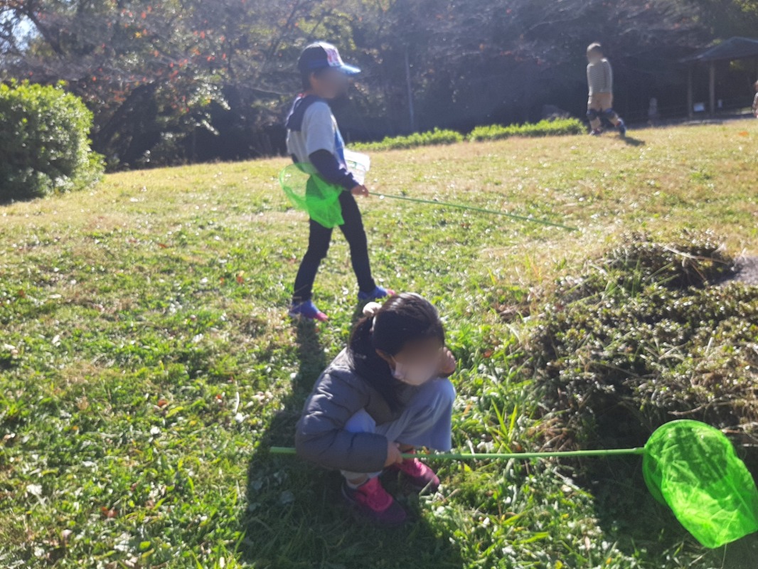 2021.11.13 二子山公園 日々のこと 二子山公園にあそびに行きました。みんなで電車を見た後は、どんぐり拾いや虫捕り、遊具など、好きなあそびを思い思いに楽しみました。帰る時に、ちゃんと約束を守って逃がしてあげることができましたよ。