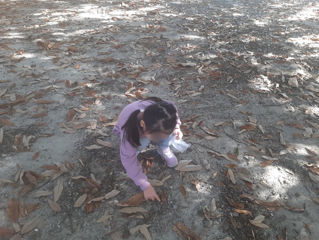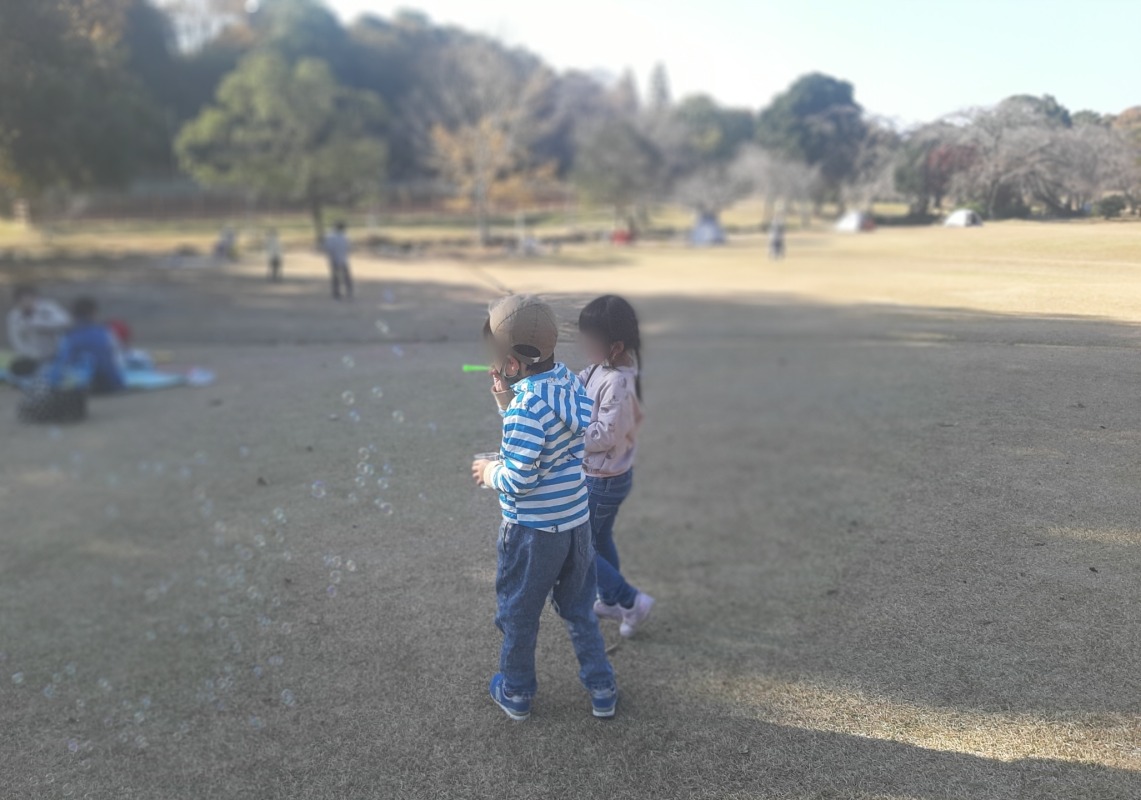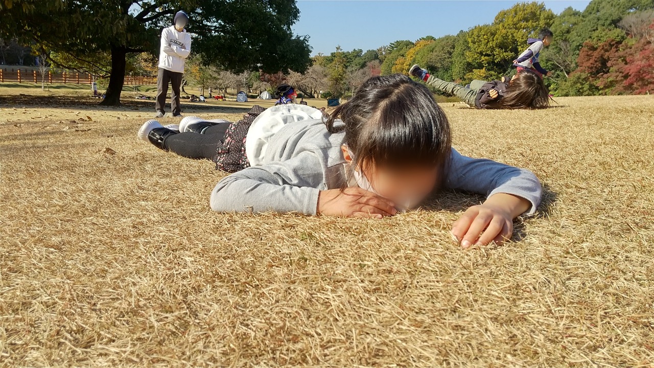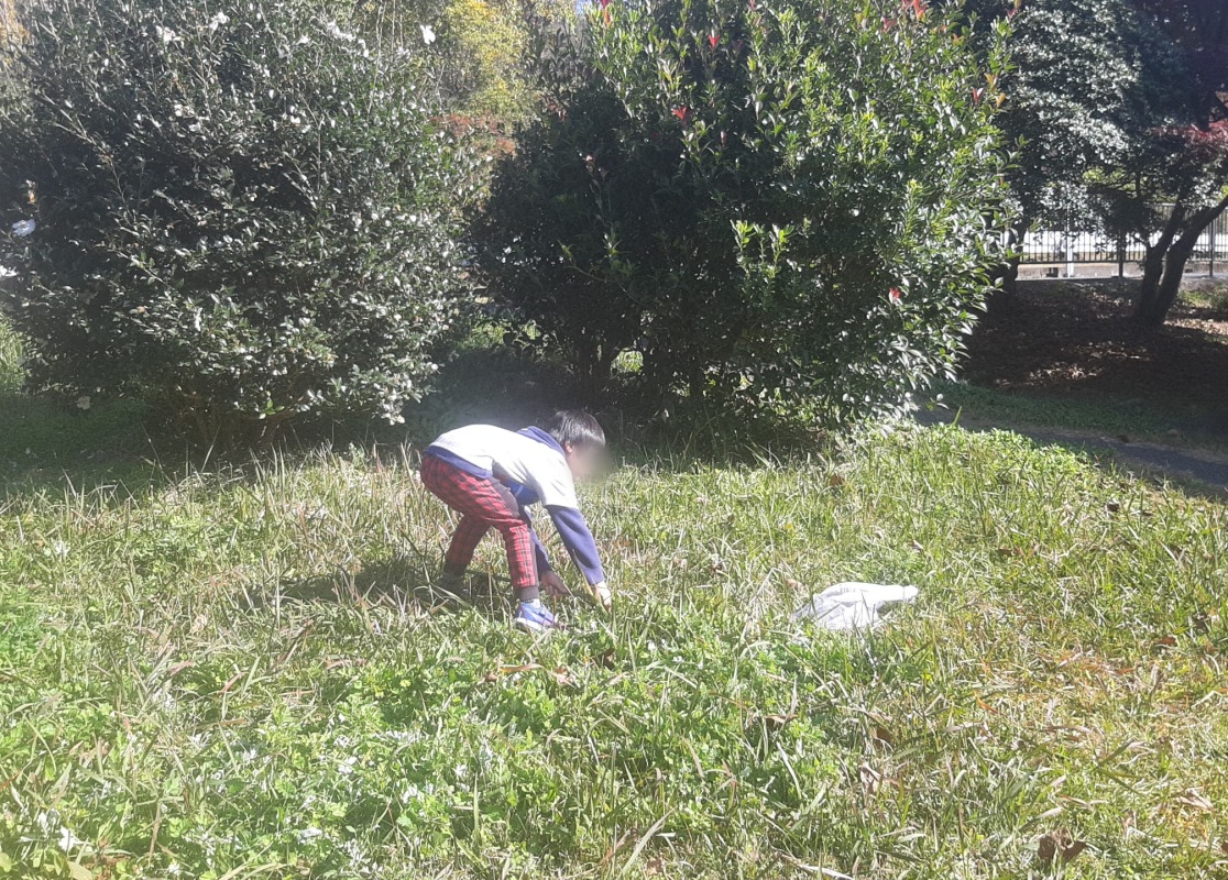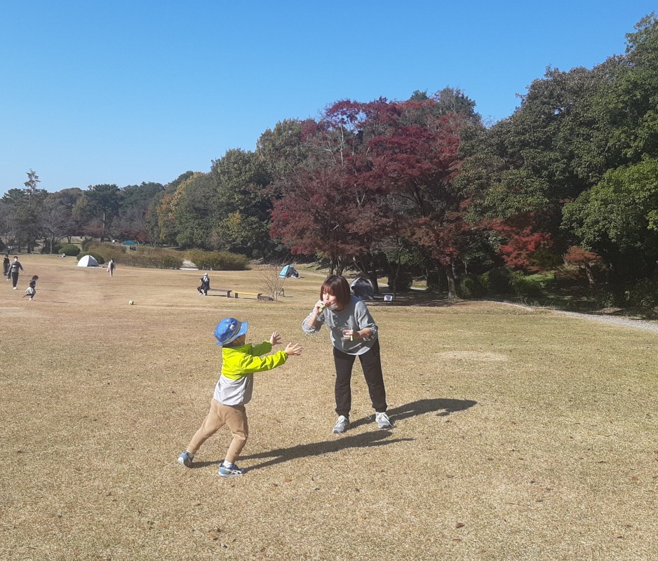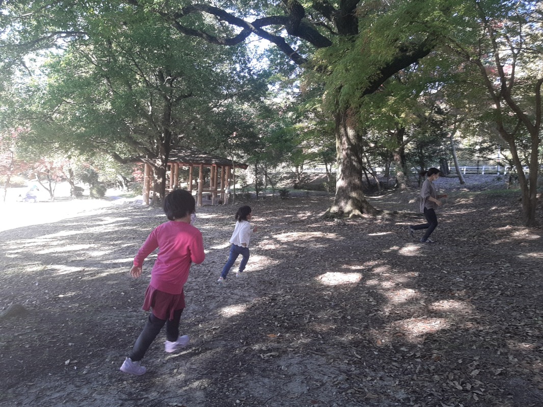 広い芝生広場や落ち葉がいっぱいの森の中でたくさんのあそびを見つけたきのねのこどもたち。