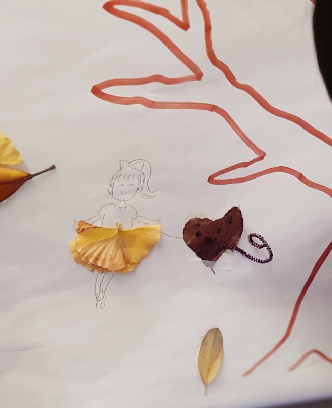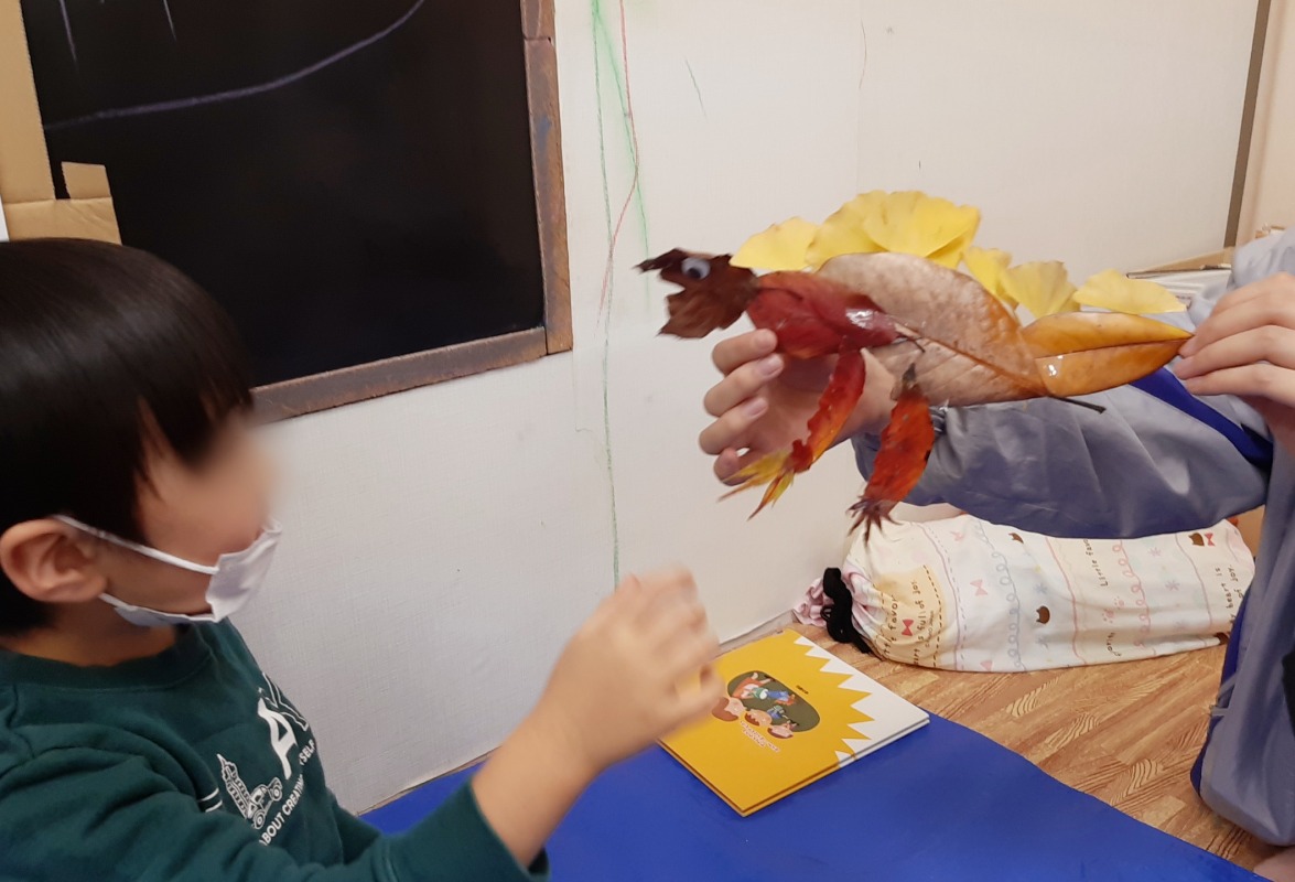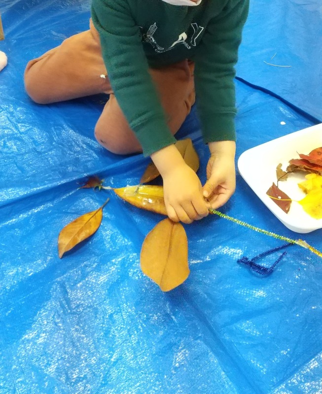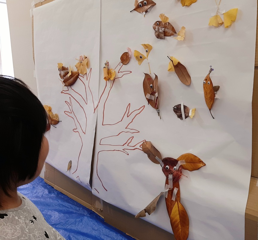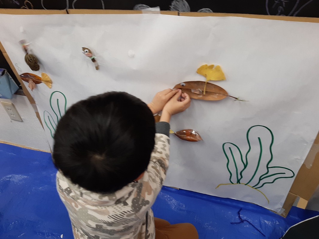 2021.11.28 落ち葉アート 日々のこと 落ち葉アート。みんなで一緒に作品を作り上げました。大好きな恐竜を、スタッフと一緒に作りました!決まった物を作らなくてはいけない、というルールはありません。木やワカメなど、イメージを膨らませやすいように、予め絵は描いておきましたが、あとは自由です。そこにあるもの(葉っぱ、木の実、モール、シール、マジック、テープ)を使って、自由に作ります。子どもの自由な発想を大切に。きのねの基本です。