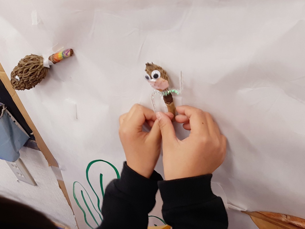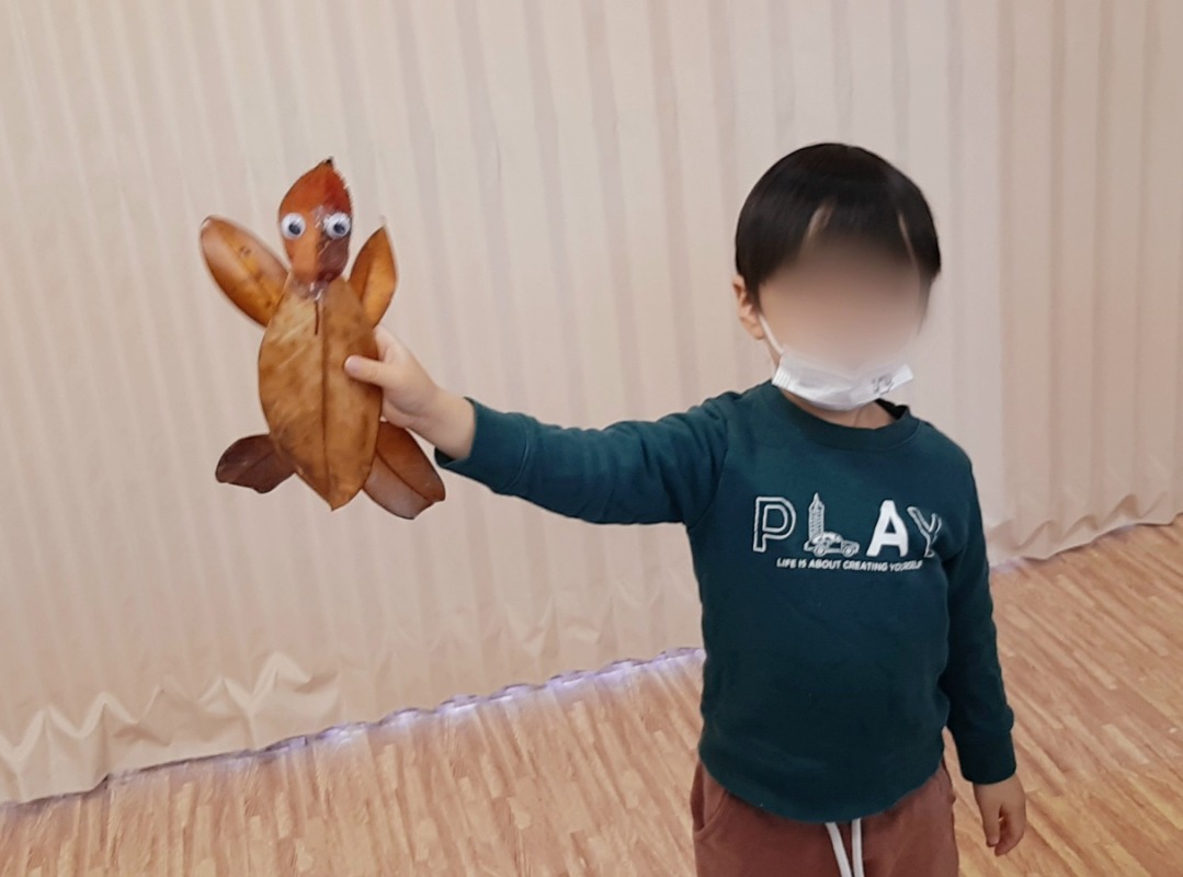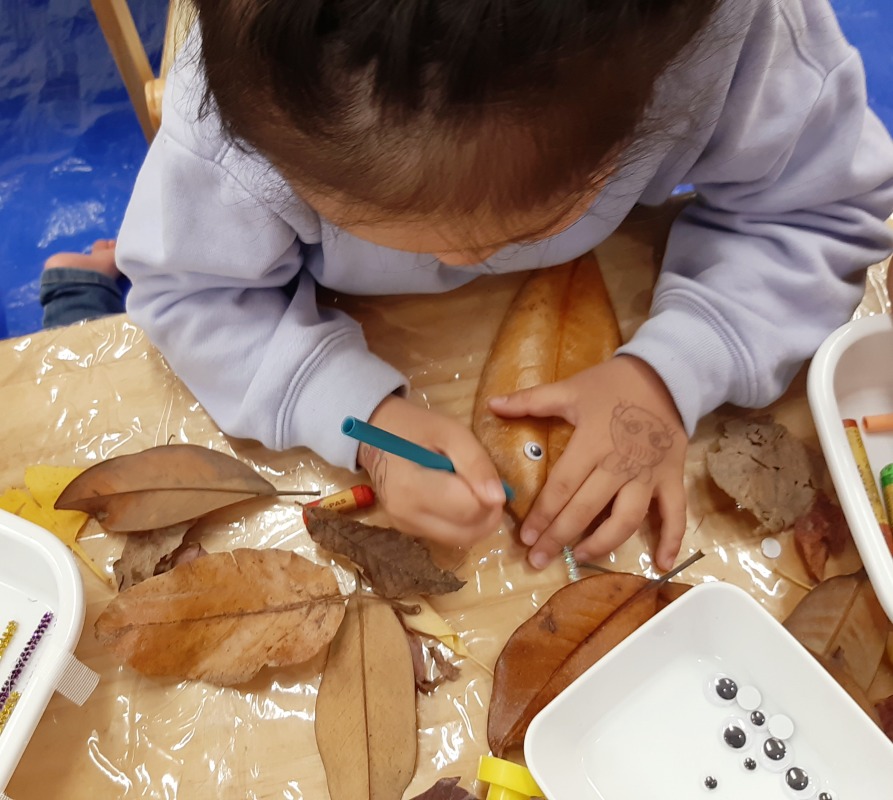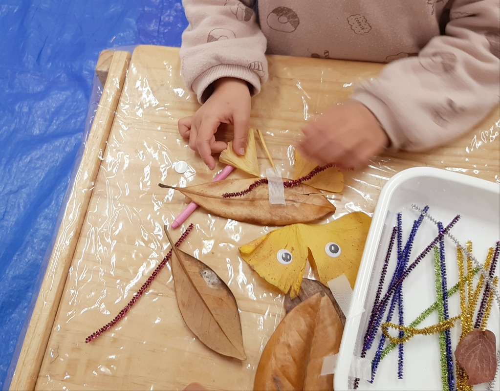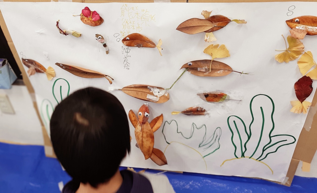 2021.11.28 落ち葉アート 日々のこと 落ち葉アート。みんなで一緒に作品を作り上げました。大好きな恐竜を、スタッフと一緒に作りました!決まった物を作らなくてはいけない、というルールはありません。木やワカメなど、イメージを膨らませやすいように、予め絵は描いておきましたが、あとは自由です。そこにあるもの(葉っぱ、木の実、モール、シール、マジック、テープ)を使って、自由に作ります。子どもの自由な発想を大切に。きのねの基本です。