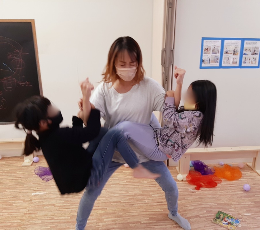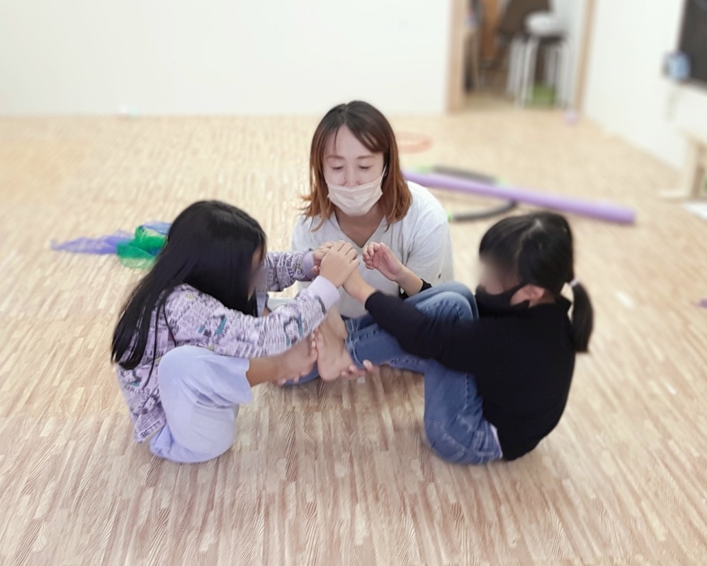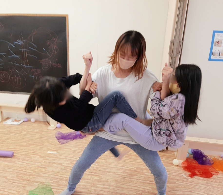 2021.11.30 コアラのポーズ 日々のこと 二人で力を合わせます。上手にバランスとってます!これはコアラのポーズかな?ボディイメージの形成にとても役立つしがみつきあそび。スタッフはいつでも子どもたちのために必死です!