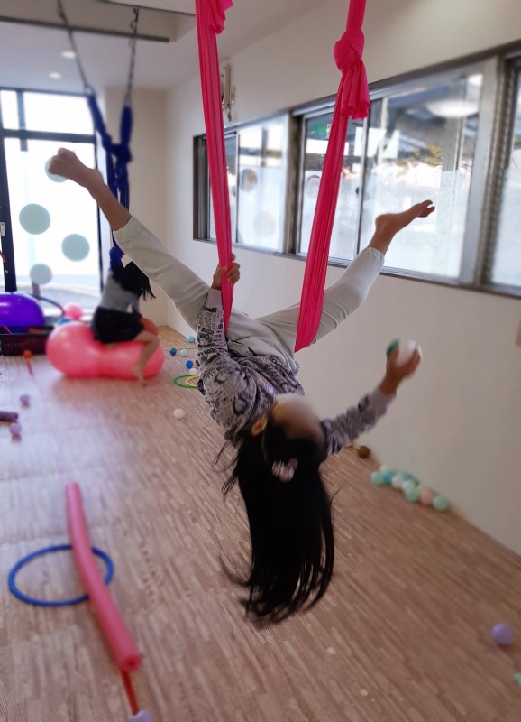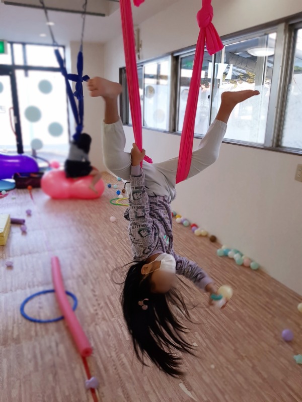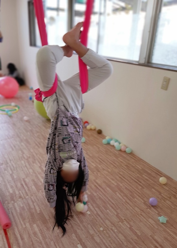 2021.12.1 アクロバティック 日々のこと 足を大きく開いて何をするのかな?後ろに倒れていきます!逆さまになりました!足を絡めて、安定した姿勢でぶら下がっています。大人は怖くてマネできない…けど勇敢に挑戦し、スタッフの助けを借りながらですが、成功した子がいました。やらされるのではなく、自らやってみたい、と思い挑戦すること。発達支援にとって、その環境があることがとても大切だと思っています。