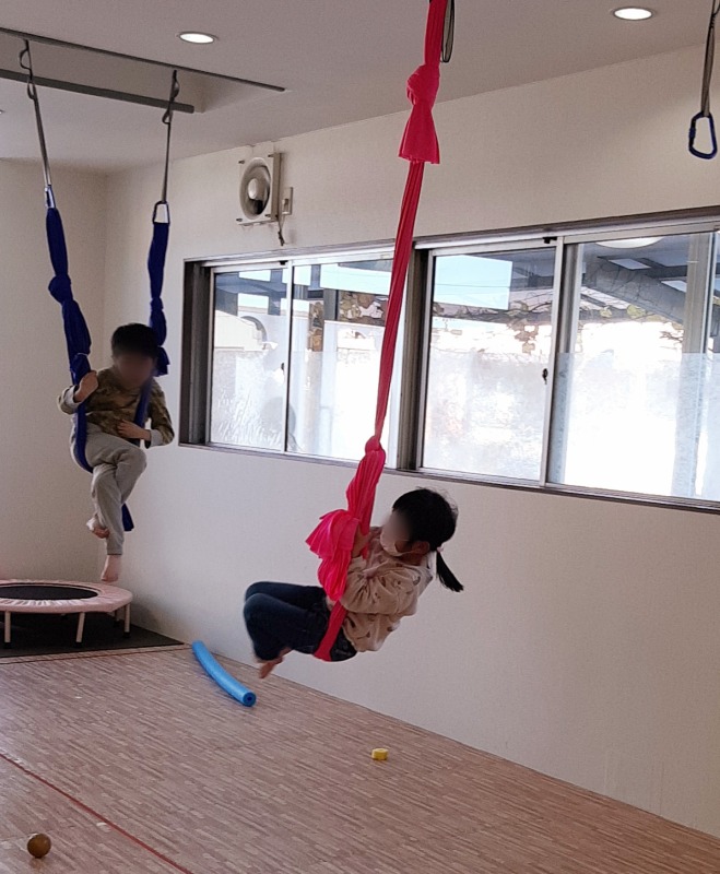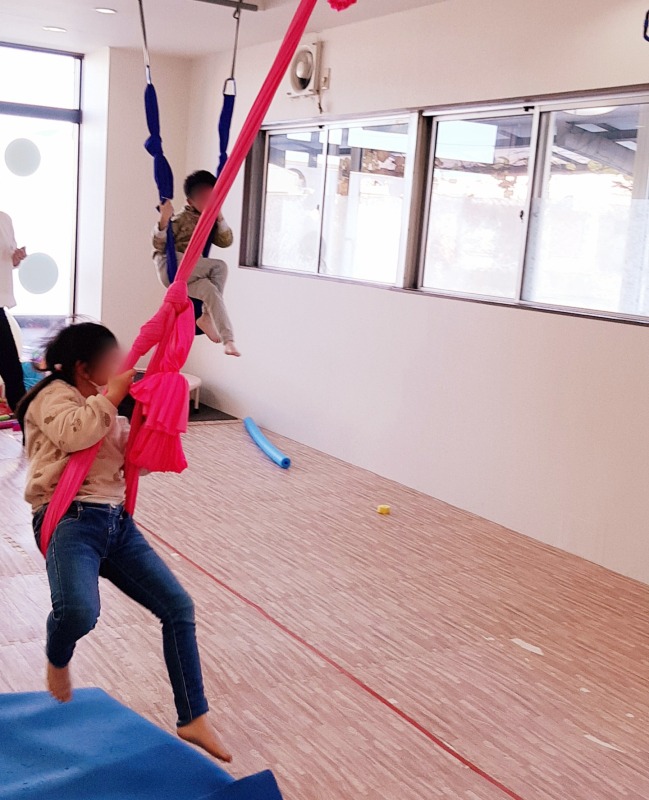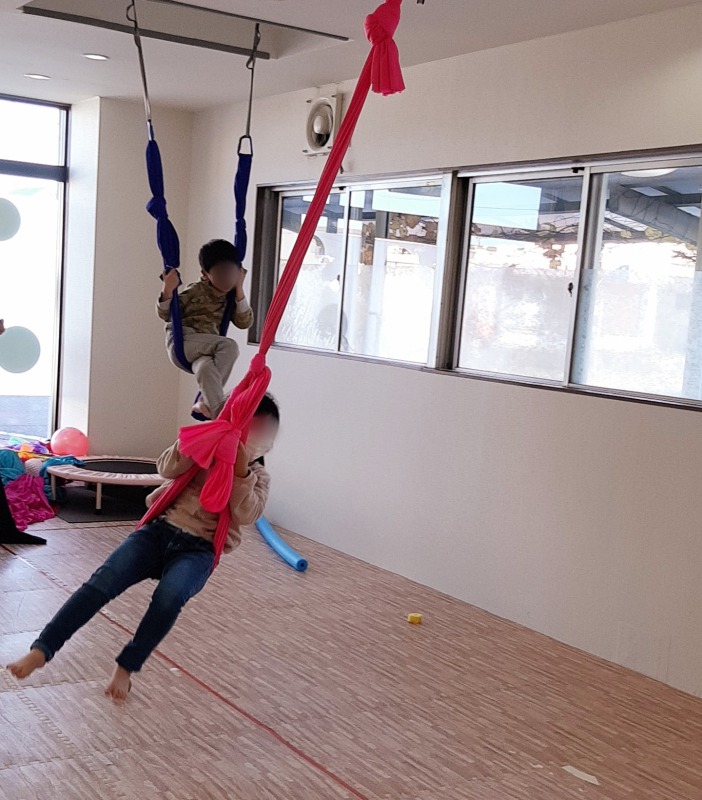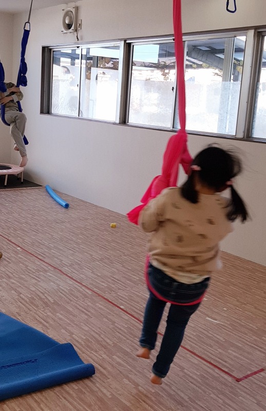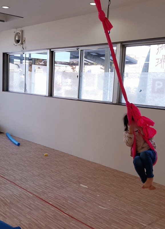 2021.12.21 旋回ハンモック 日々のこと ハンモックで輪っかを作って、勢いをつけてスタート!勢いよく旋回し始めました。まるで遊園地にいるみたいに、いい感覚刺激が入っています。ハンモック一つで、可能性は無限に広がります。