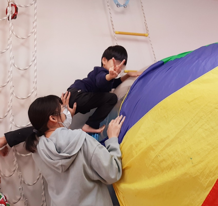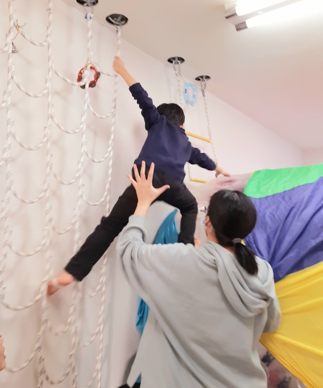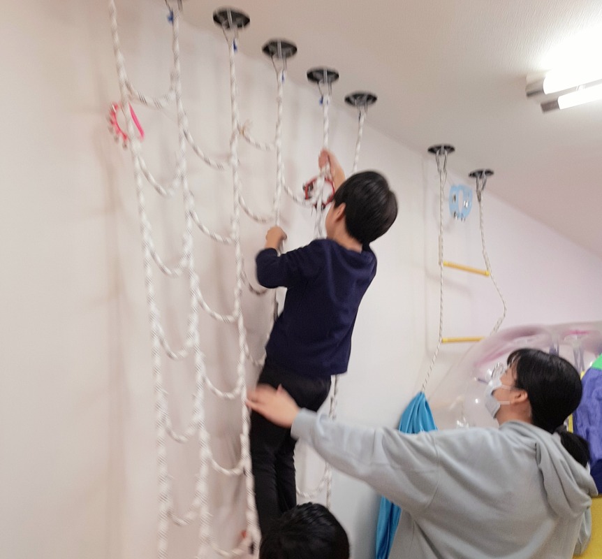 2022.1.7 できたよ! 日々のこと クライミングラダーを登って…ちょっと離れたサイバーホイールに足を伸ばします。けっこう離れてるけど、いけるか??カメラを向けると余裕の表情でピース。無事にサイバーホイールに移って登ることができました。とても満足そうです。いろいろな事に挑戦し、たくさんの「できた!」を積み重ねていけるよう環境を整えていきたいと思います。