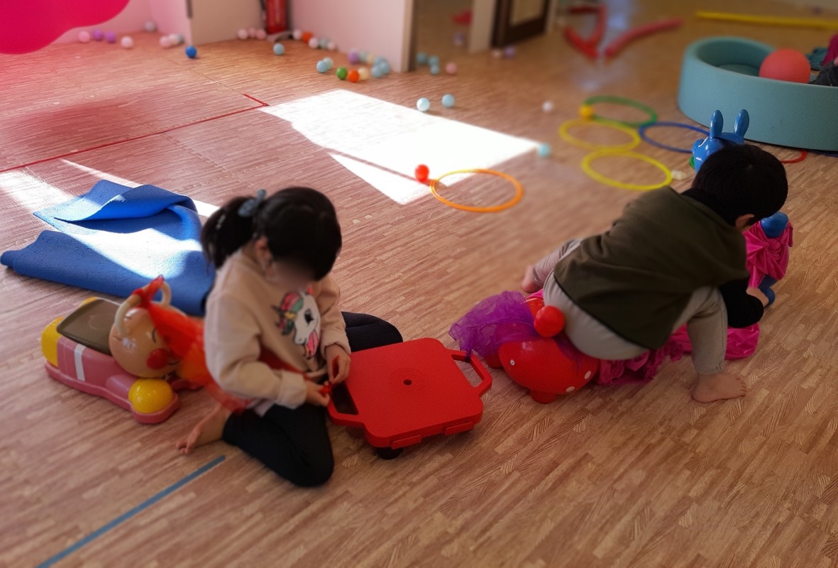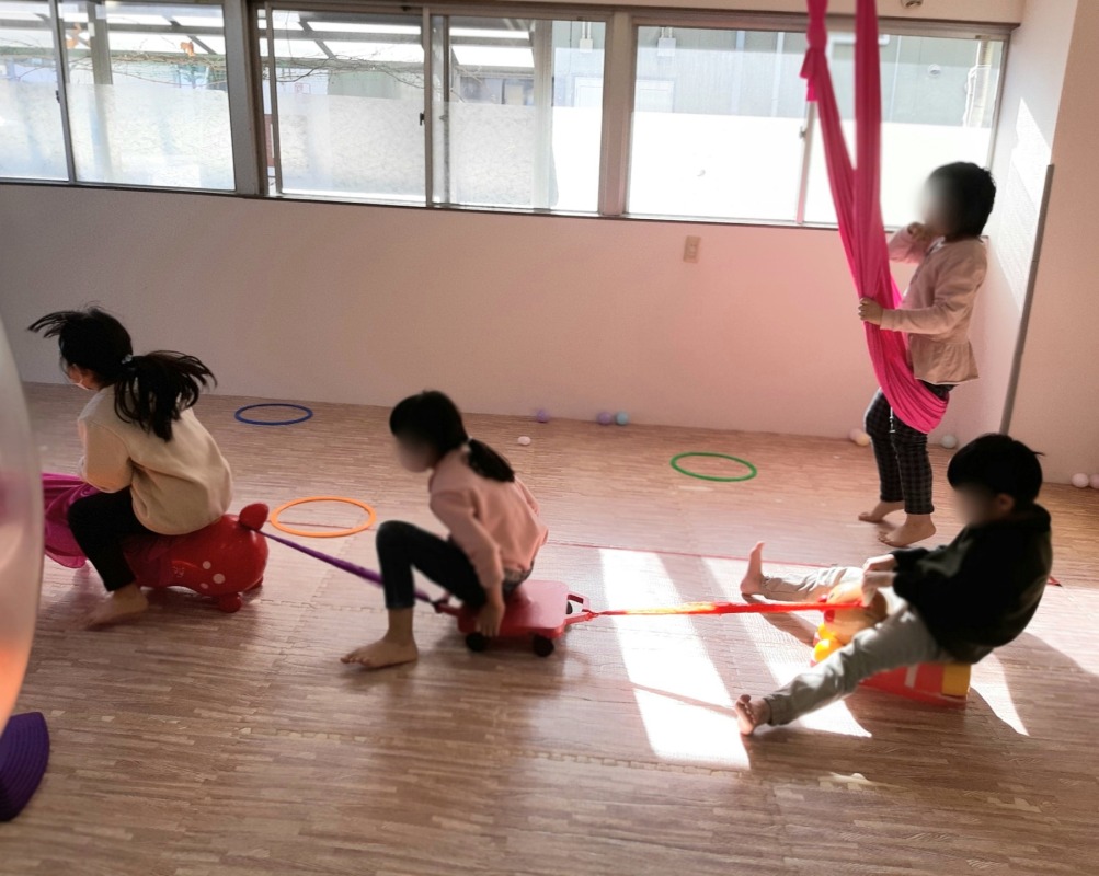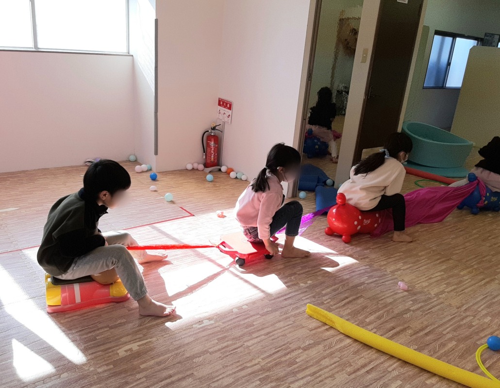 2022.1.8 2022/01/08 日々のこと スカーフを結んで、何を作っているのかな?乗り物がたくさん繋がりました。イベントのない土曜日でしたが、みんなで団結して、体を使うあそびを思いきり楽しんでいました。
