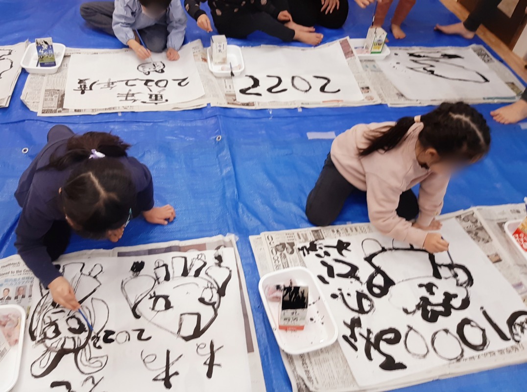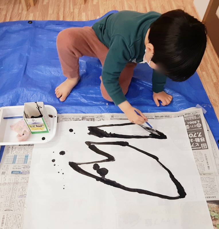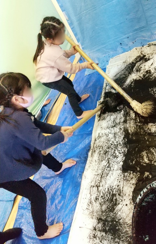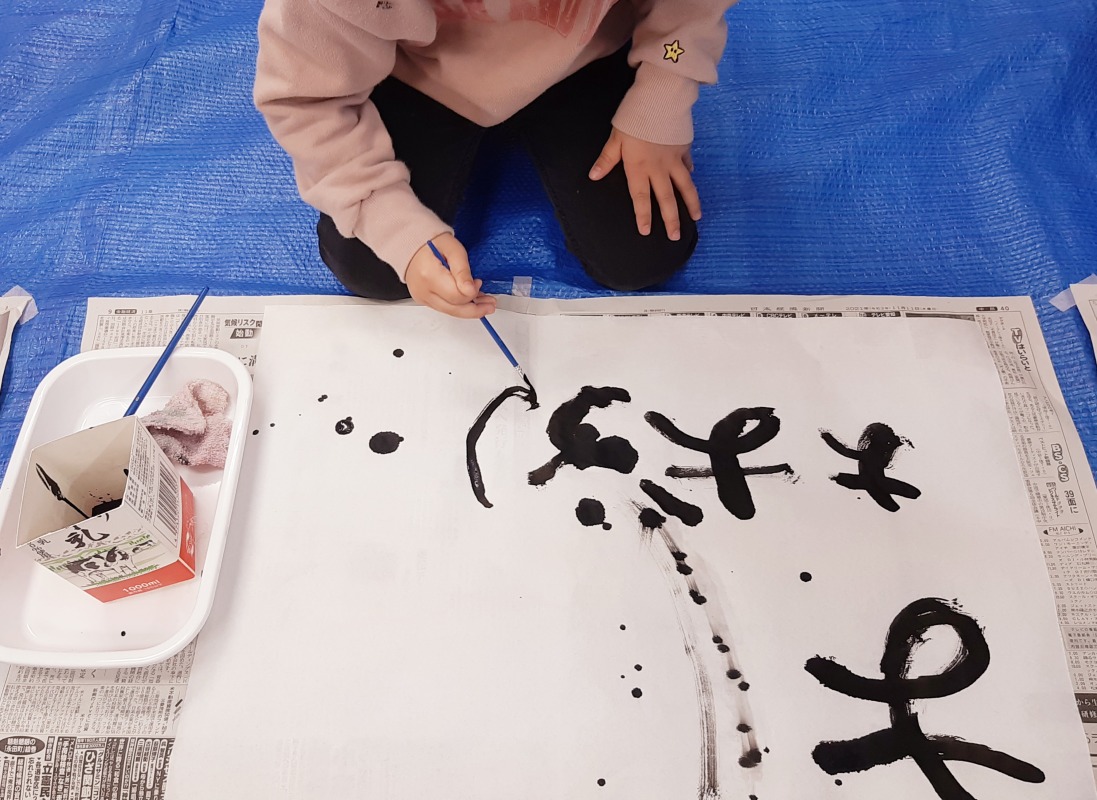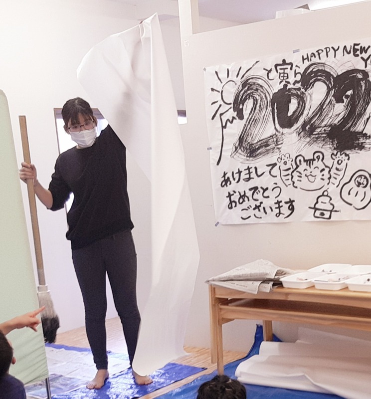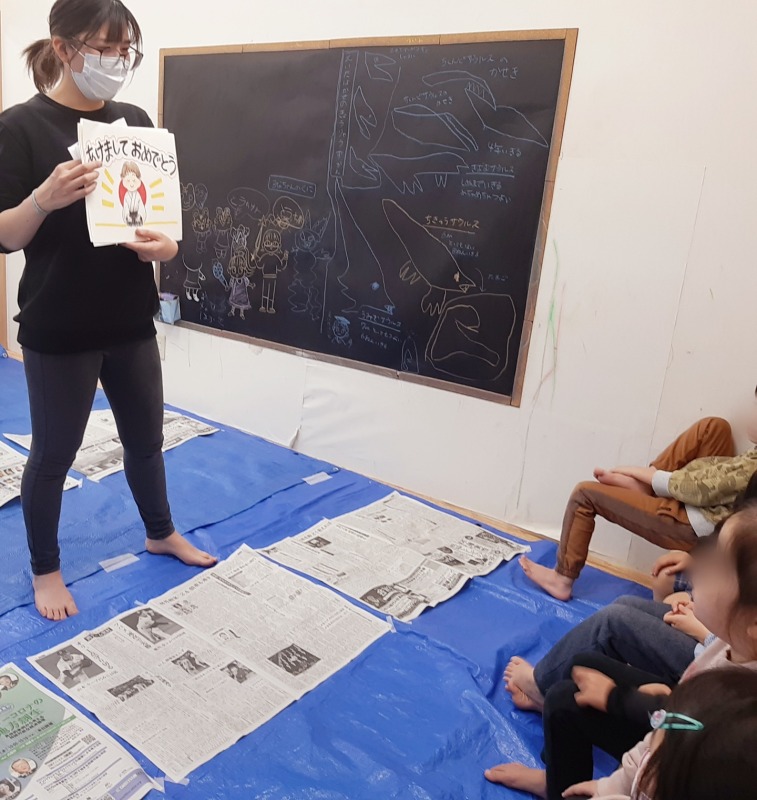 まずはスタッフ手作りの紙芝居で、書き初めについて理解を深めます。みんな興味津々!