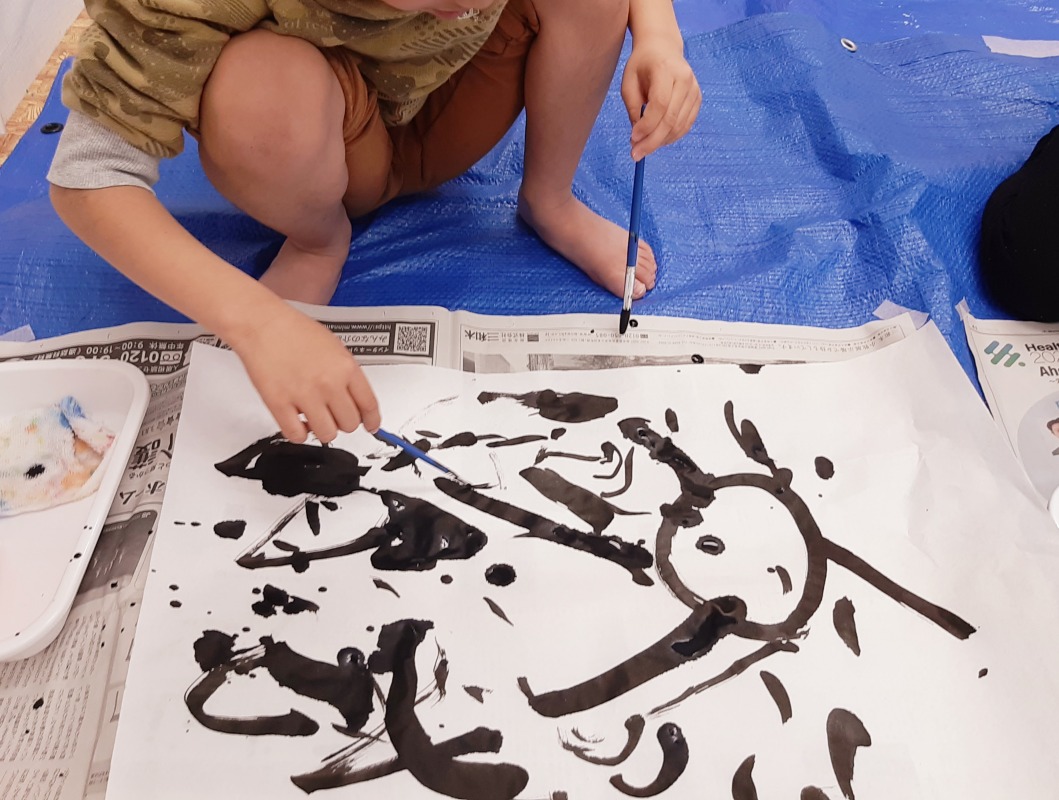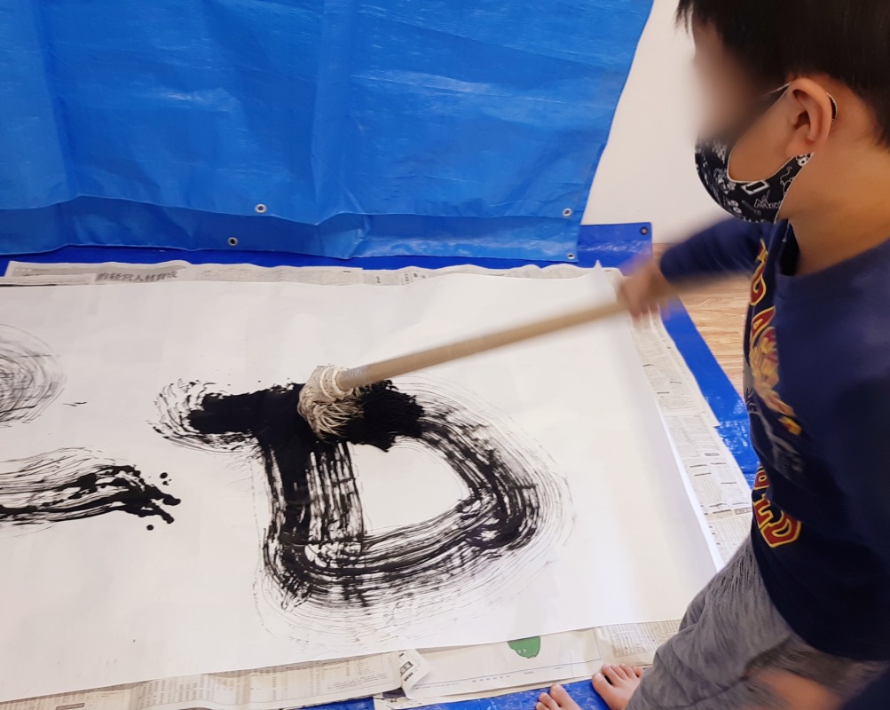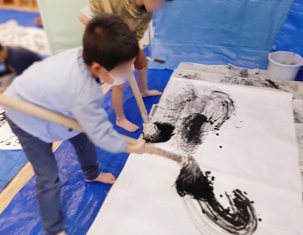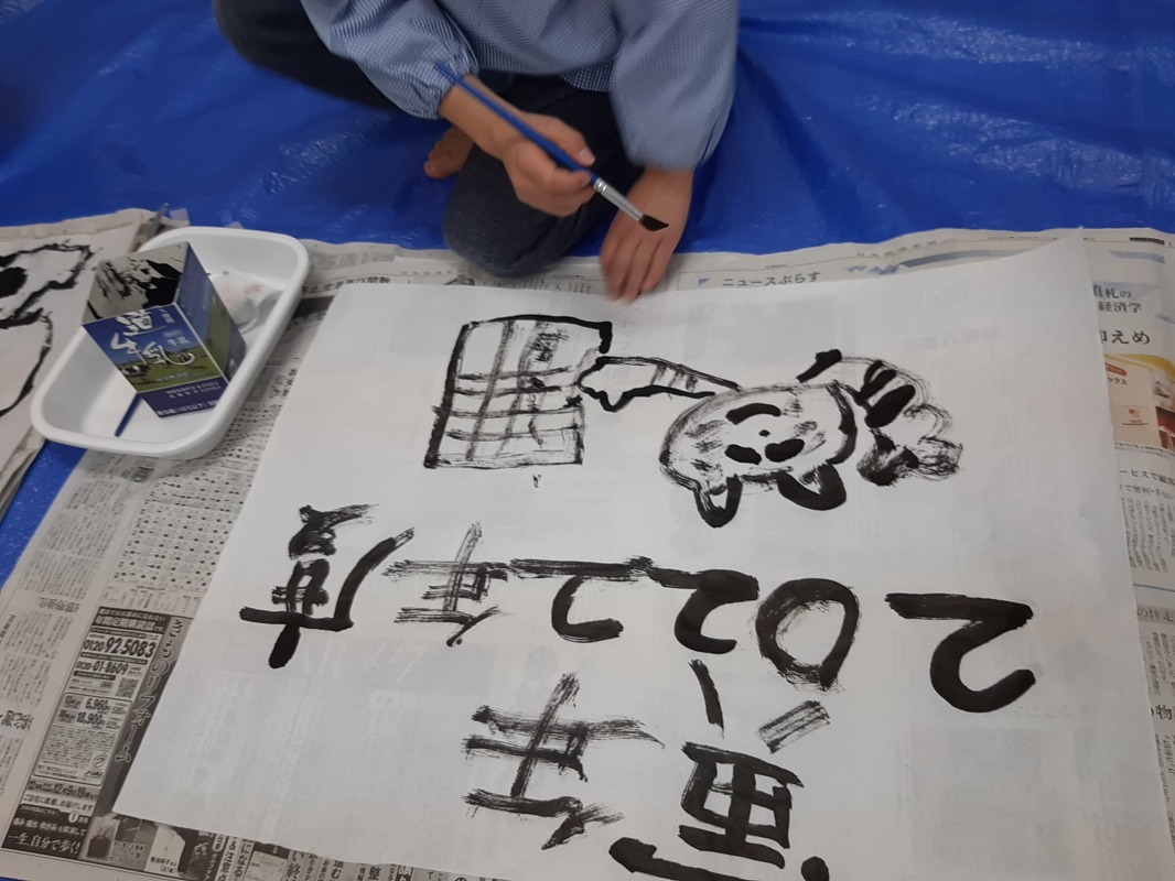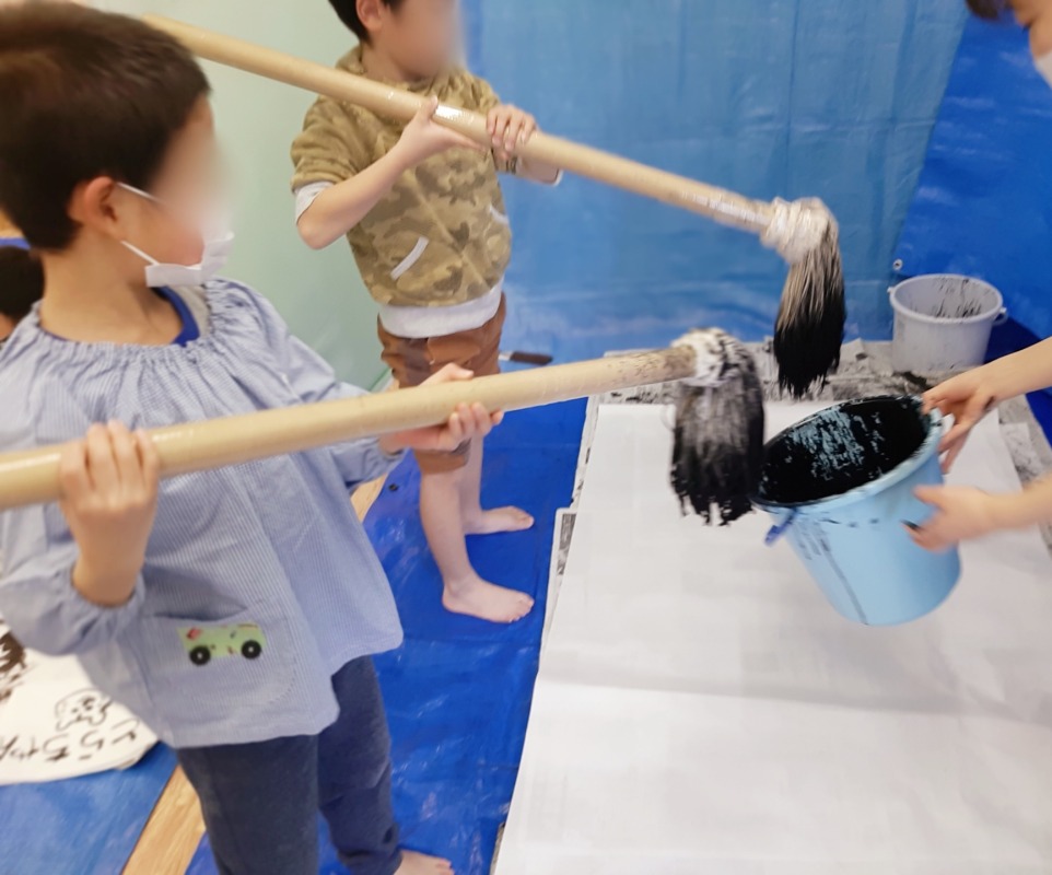 まずはスタッフ手作りの紙芝居で、書き初めについて理解を深めます。みんな興味津々!
