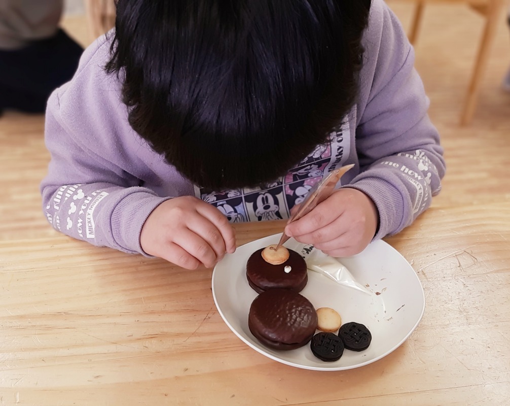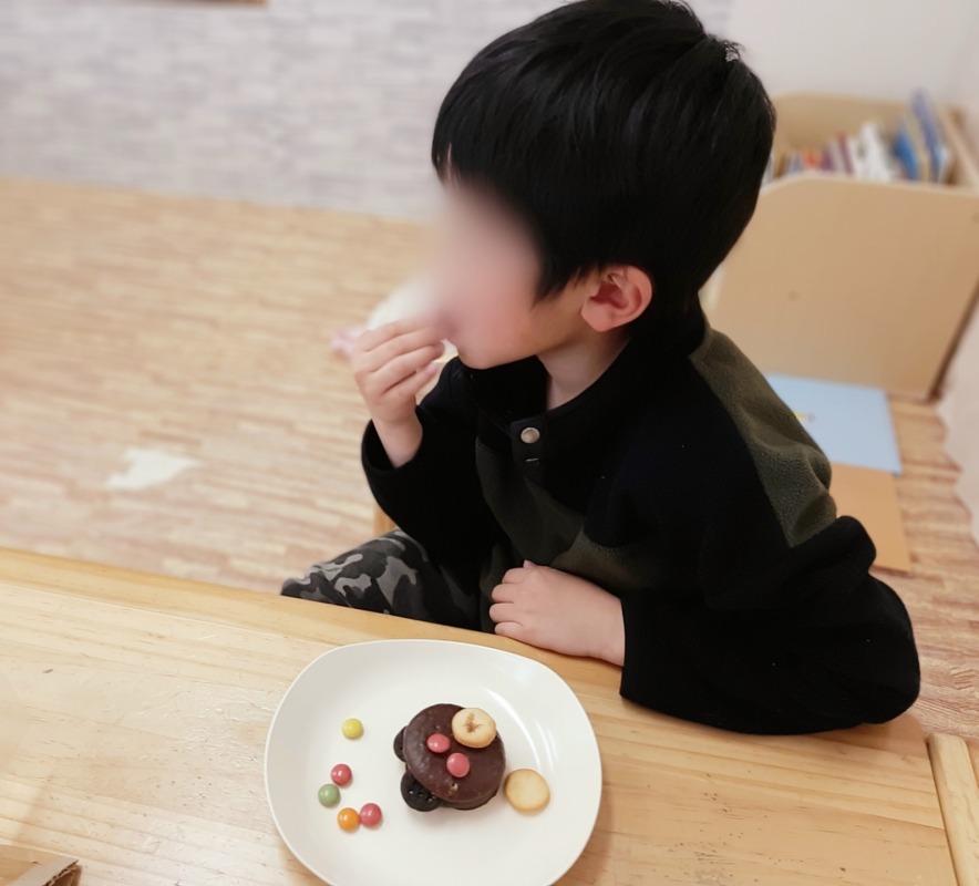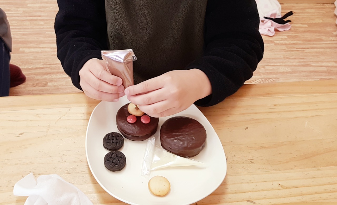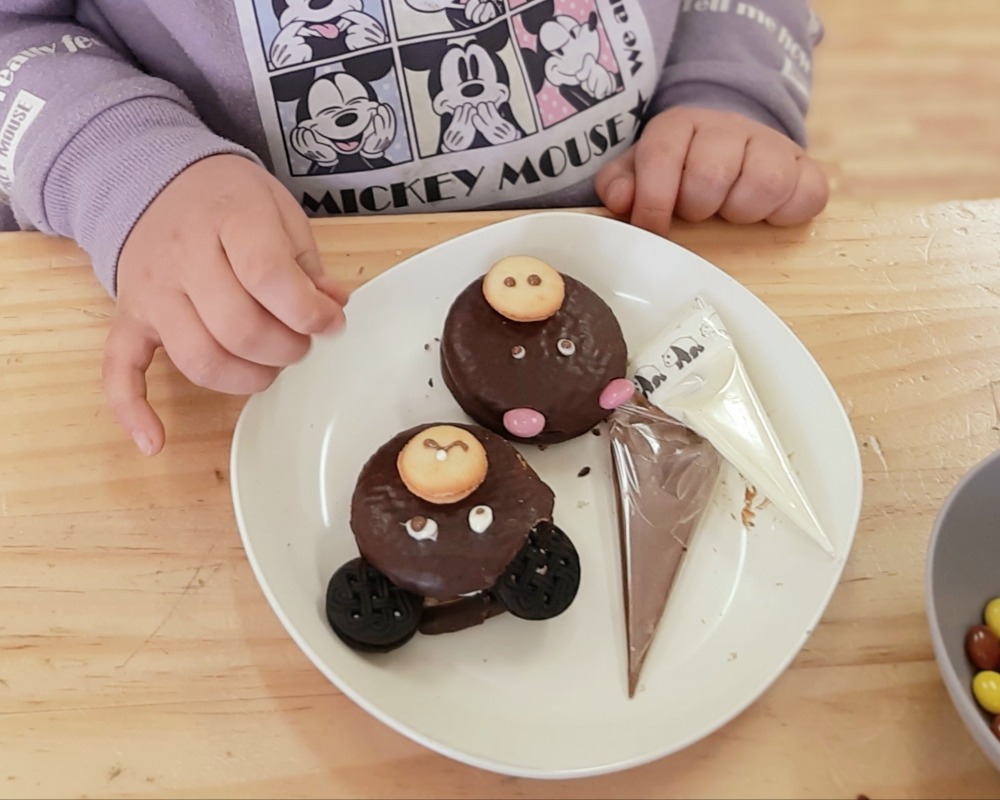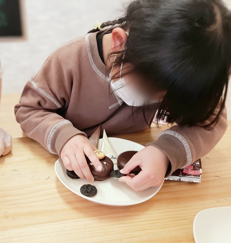 2022.2.12 バレンタインクッキング 日々のこと バレンタインクッキング。とても楽しみにしていた子が多かったので、時間差で一人一テーブル使い、感染対策に気を付けながら実施しました。チョコペンでお絵描き。クッキーを飾ります。とってもカワイイくまさんとぶたさんができあがりました。かわいくて、食べるのがもったいないね。おうちの人にもプレゼント。喜んでくれるかな?