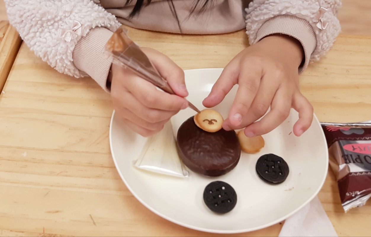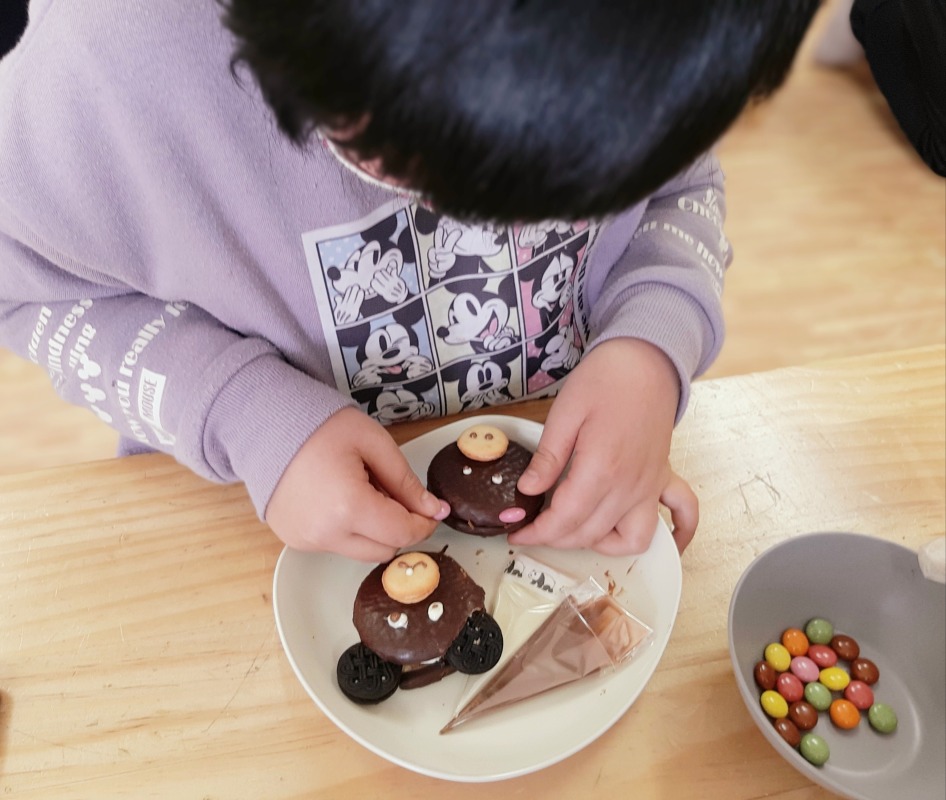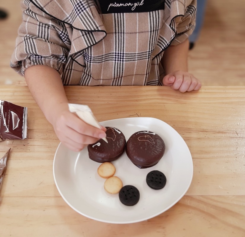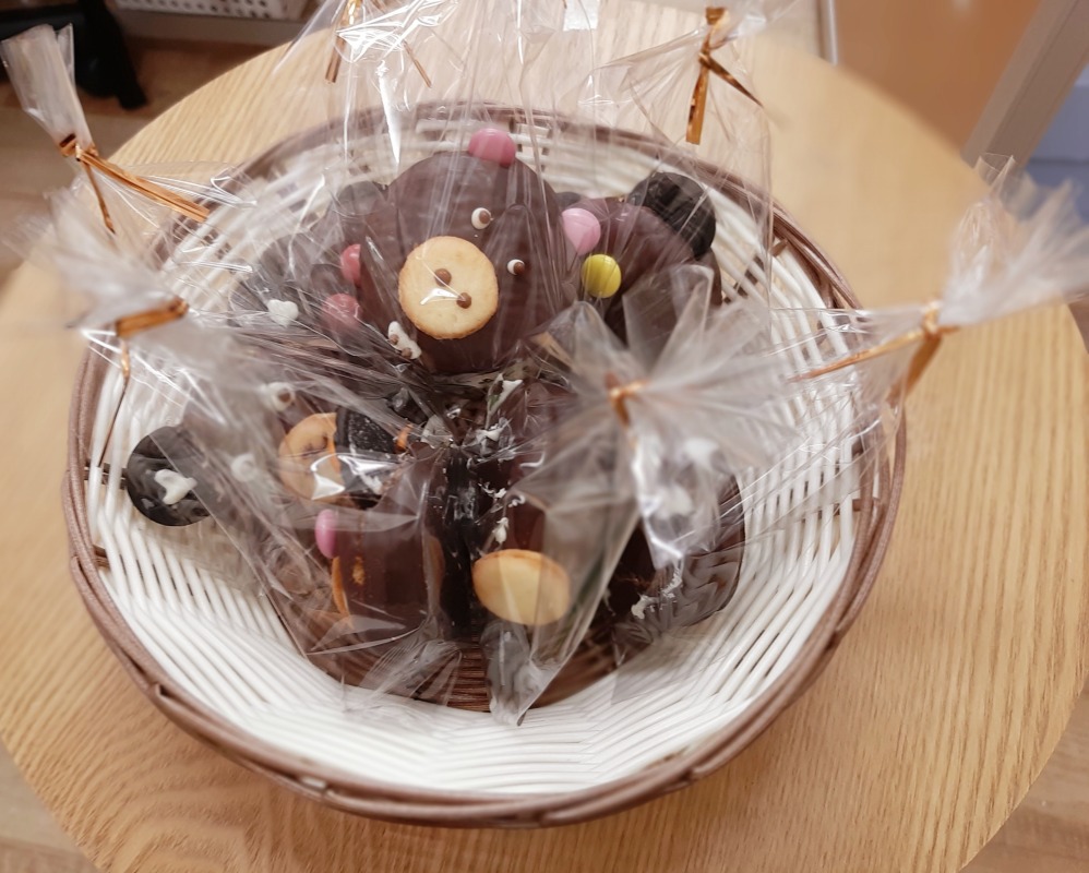 2022.2.12 バレンタインクッキング 日々のこと バレンタインクッキング。とても楽しみにしていた子が多かったので、時間差で一人一テーブル使い、感染対策に気を付けながら実施しました。チョコペンでお絵描き。クッキーを飾ります。とってもカワイイくまさんとぶたさんができあがりました。かわいくて、食べるのがもったいないね。おうちの人にもプレゼント。喜んでくれるかな?