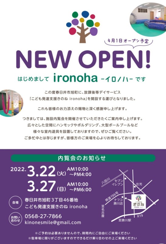 この度、こども発達支援きのねでは、2022年4月1日オープン予定の「こども発達支援きのね ironoha」の内覧会を開催することになりました。