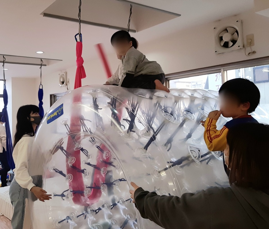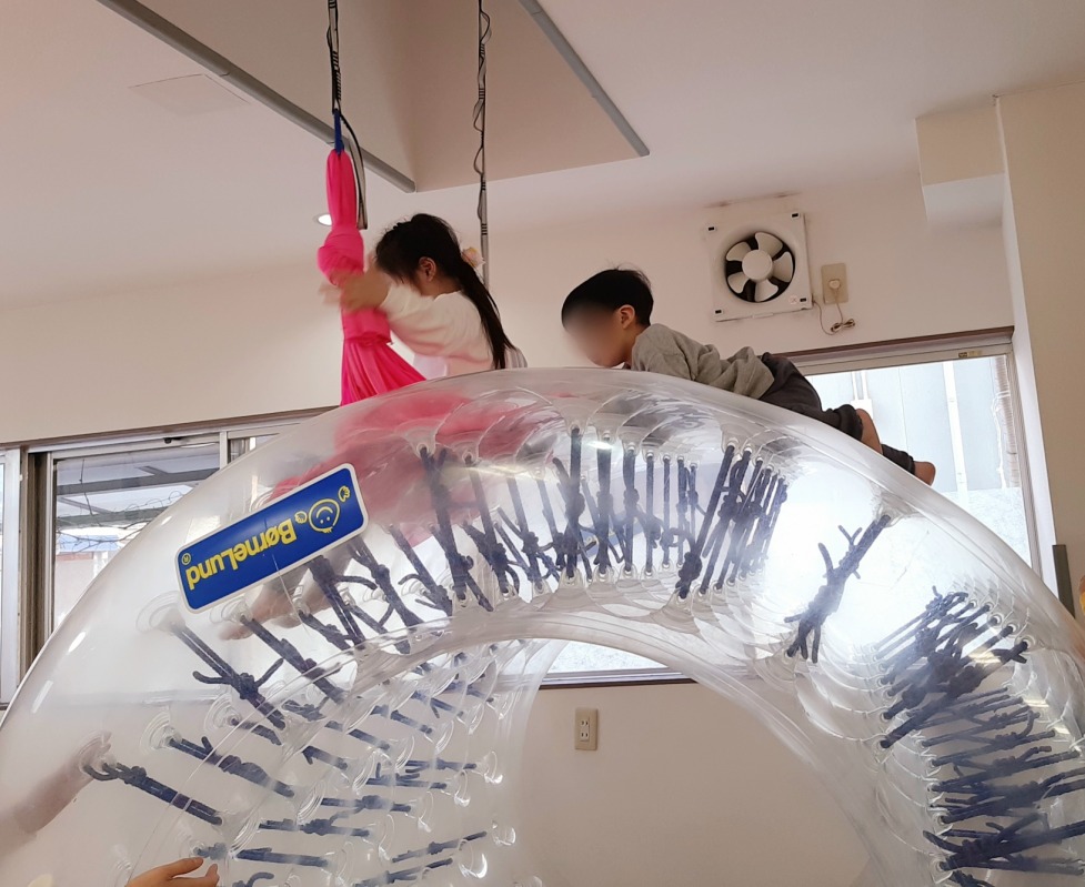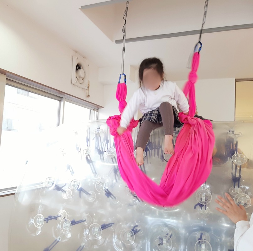 2022.3.1 2022/3/1 日々のこと サイバーホイールとハンモックを組み合わせたあそび。サイバーホイールの上に乗ってそのままハンモックへ。上手に乗れるかな?ちょっと怖そうにしていましたが、この後無事ハンモックに乗ることができました。子どもたちのアイデアで、あそびの可能性はどんどん広がっていきます。
