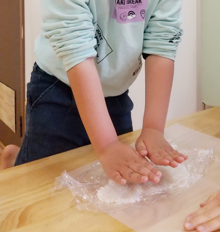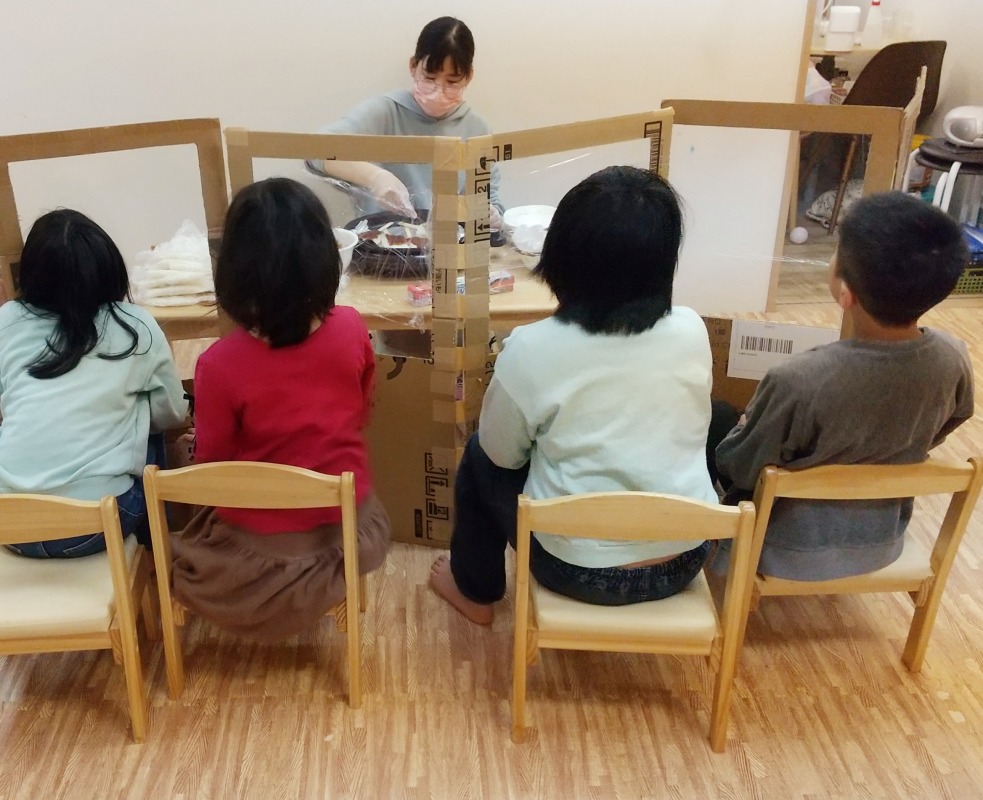 2022.3.19 五平餅づくり 日々のこと 五平餅づくりをしました。ごはんをぎゅーっと押しながら成型していきます。ホットプレートで焼く様子も見たい!ということで、スペシャルパーテーションを設置。やけどと飛沫対策を万全にしながら、焼いてる様子もしっかり観察しました。お店で売ってるみたいな五平餅ができて、大満足の子どもたちです。