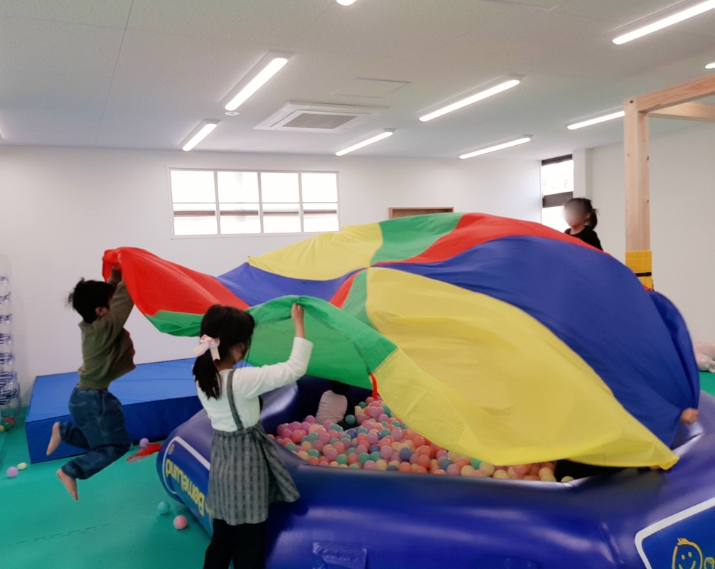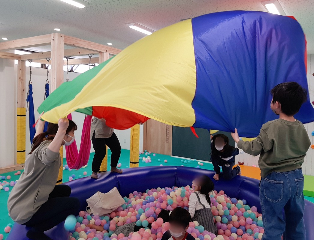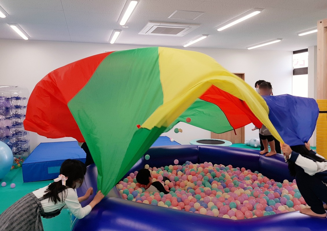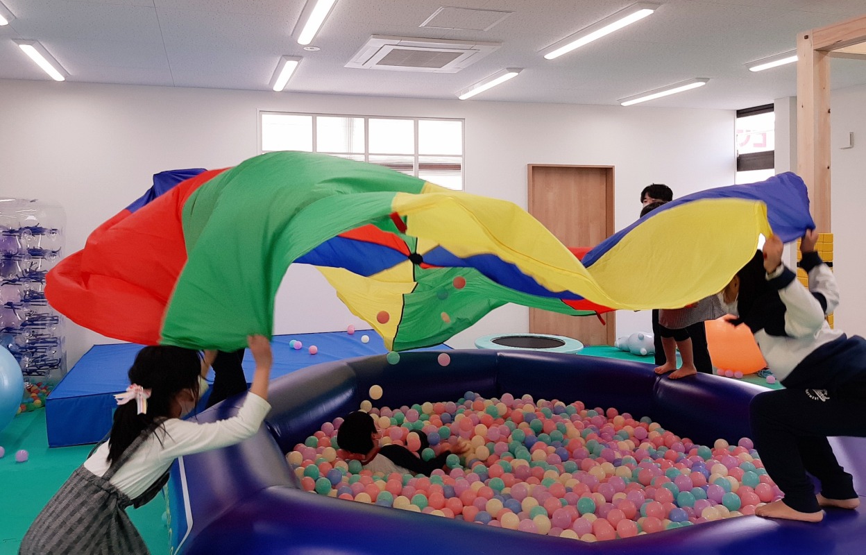2022.4.7 ironoha パラバルーン 日々のこと ボールプールの上でパラバルーン。最初は合わせるのが難しかったけど、だんだん息があってきました。スタッフも一緒に、一つの目標に向かって団結して取り組むことができました。