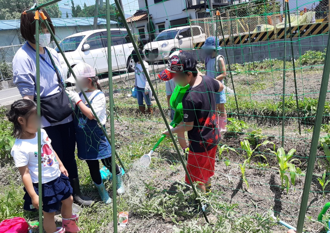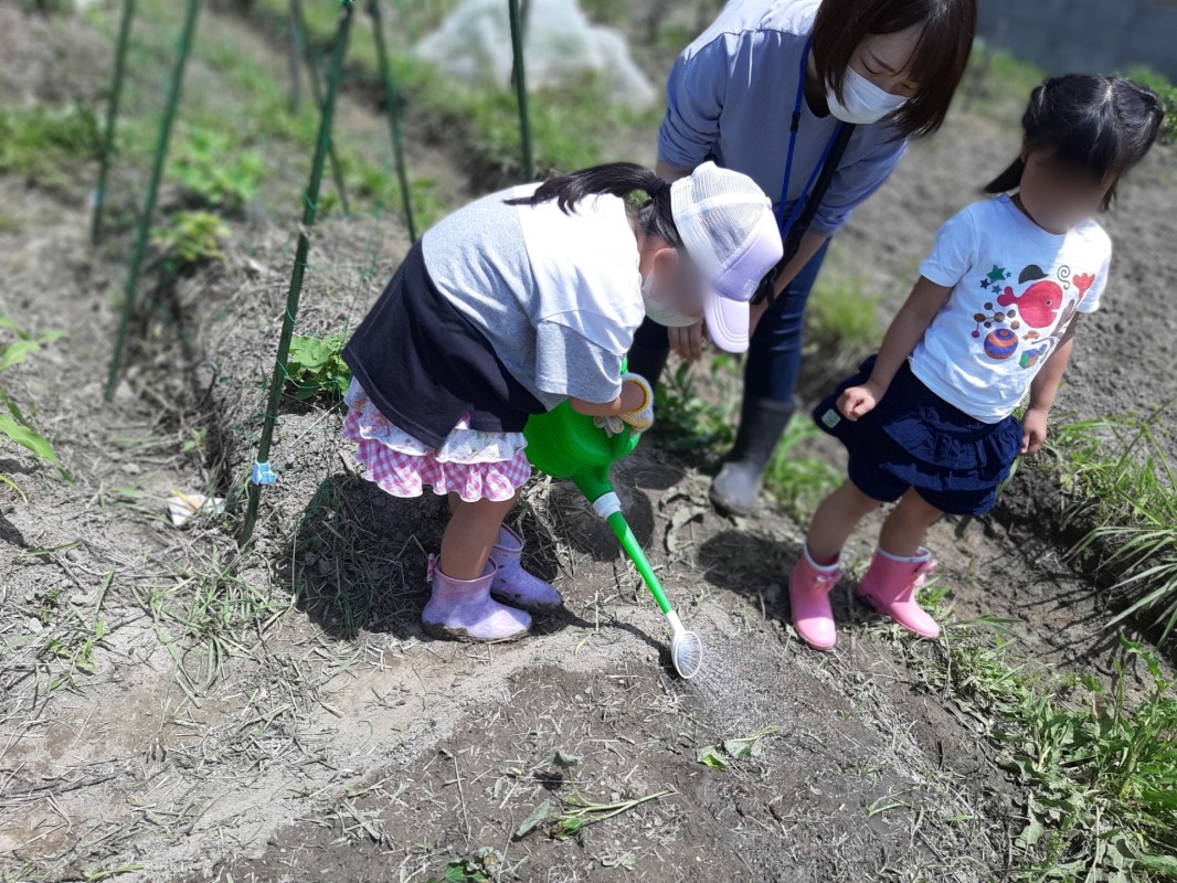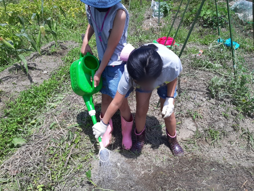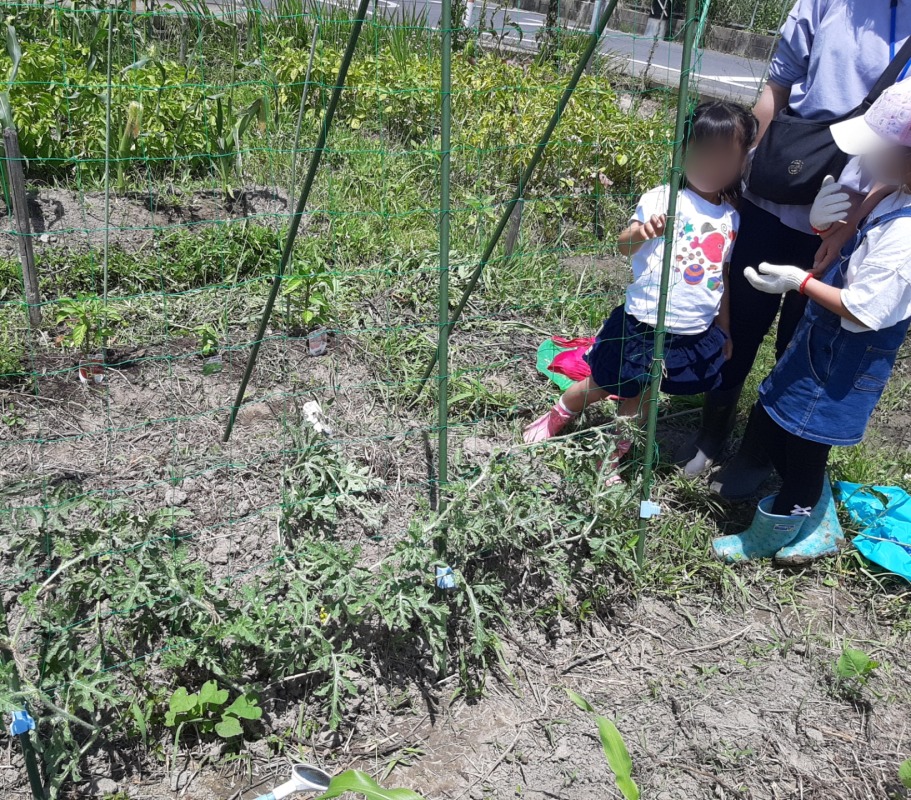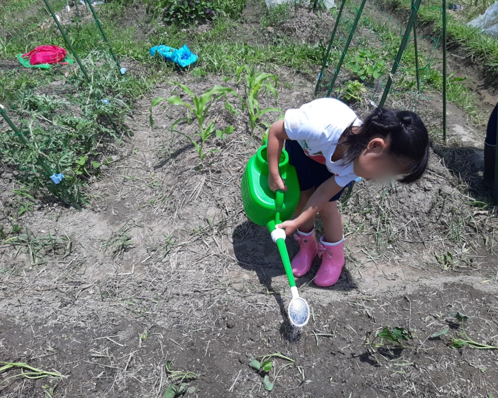 前回来た時は虫探しに夢中だった男の子ですが、「スイカに水やりたい!」と自分から言ってきました。