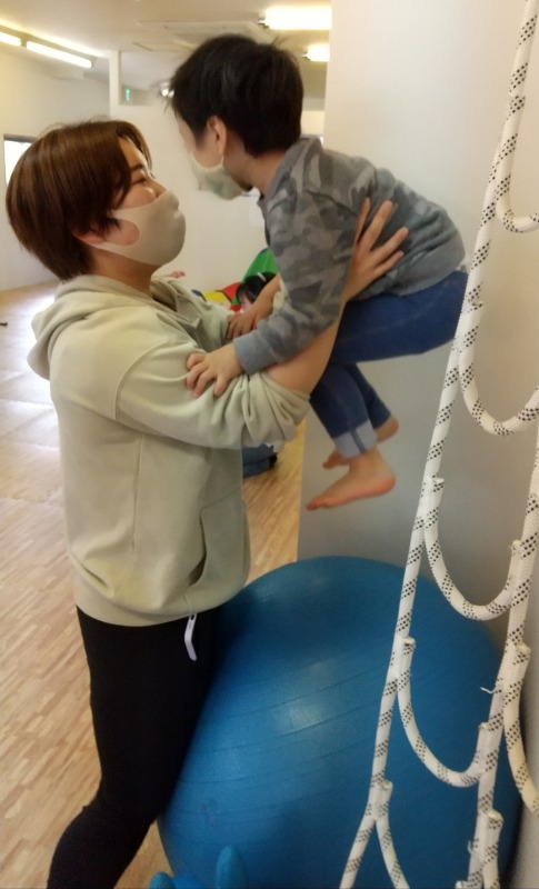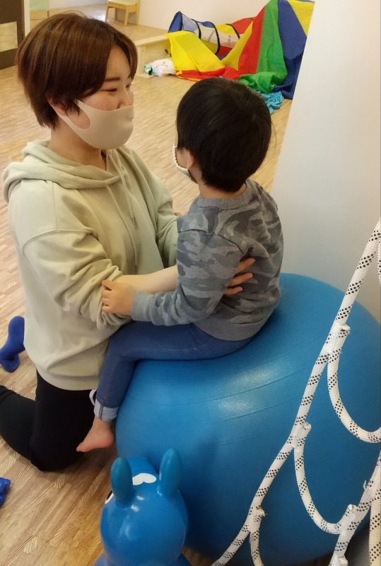 2021.4.29 バランスボール 日々のこと バランスボールに座ってはずむのも楽しいけど…こんなふうにジャンプしてみるのも楽しいね!何度もジャンプしているうちに、ずいぶん身体がしっかりしてきましたよ。身体の真ん中の線(正中線)を作っていくのに役立つバランスボール。姿勢保持力や集中力の向上に繋がっていきます。
