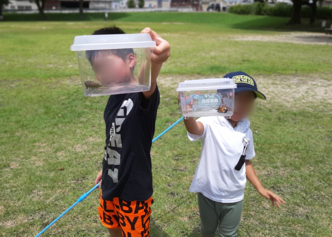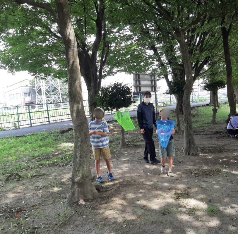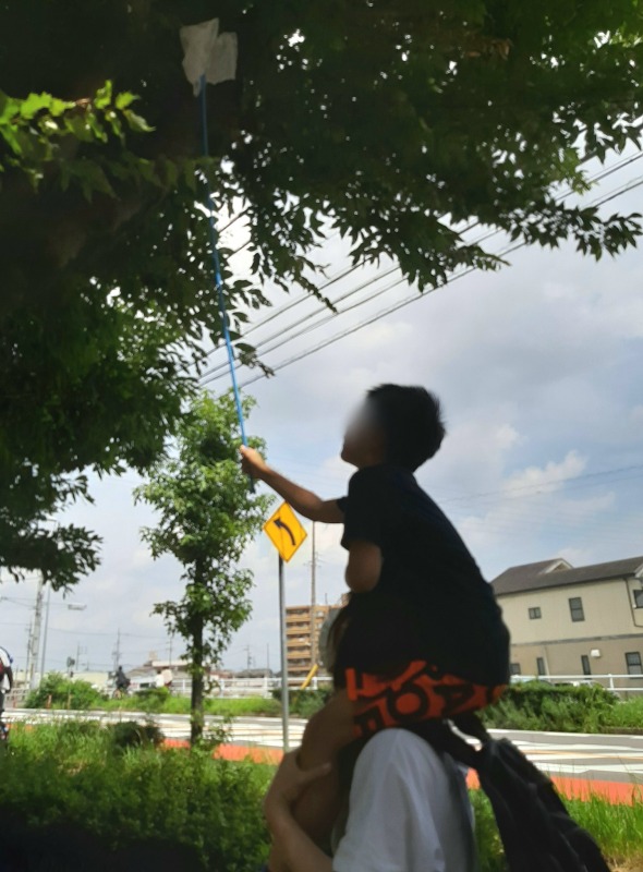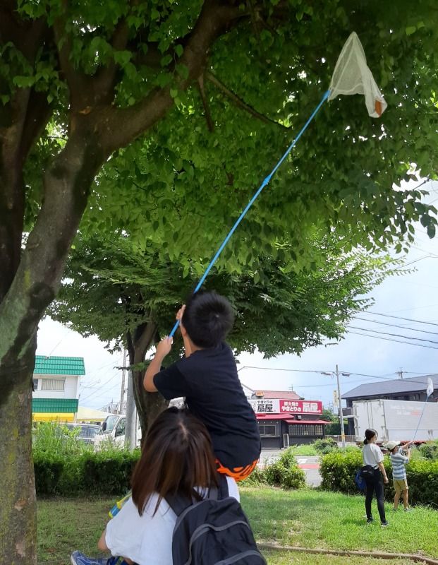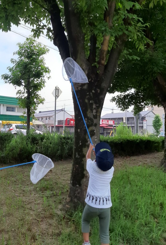 2022.8.10 ironoha セミ捕り 日々のこと 公園にセミ捕りに行きました。…セミの鳴き声がほとんど聞こえない!!焦りましたが、よーく見ると木に止まっているセミを見つけることができました。けっこう高いところにいるのでなかなか難しい…あと少し!ゲットしました!バッタもいました!帰る時は、約束を守って、虫さんたちを逃がしてあげていました。生き物大好きなきのねの子どもたち。今度は、ザリガニ釣りに行く予定です!