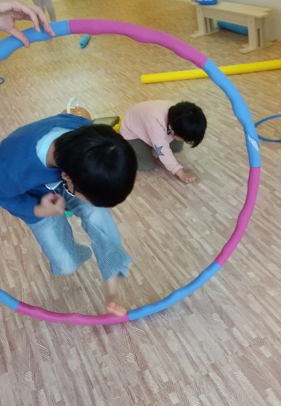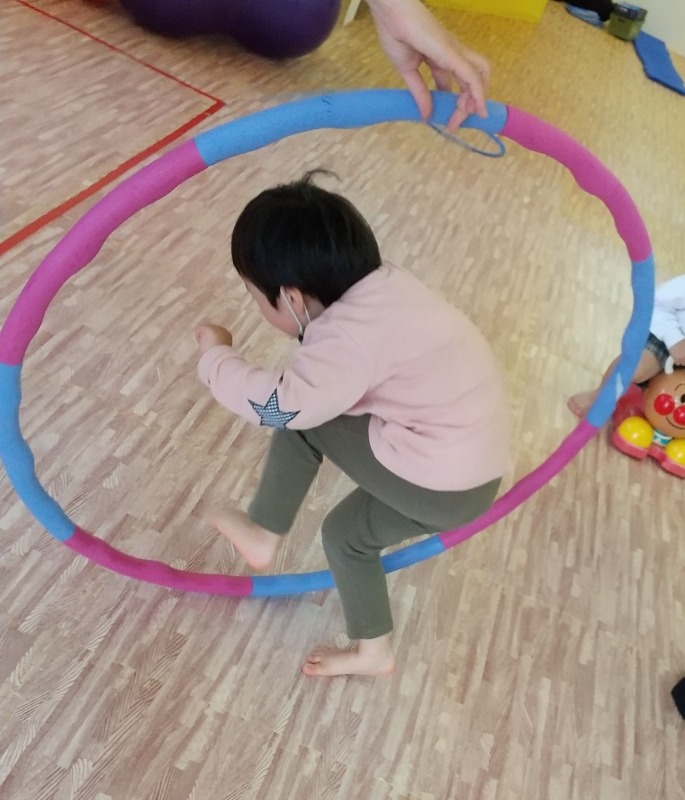 職員がくるくる回しているフラフープの中を通り抜けます。