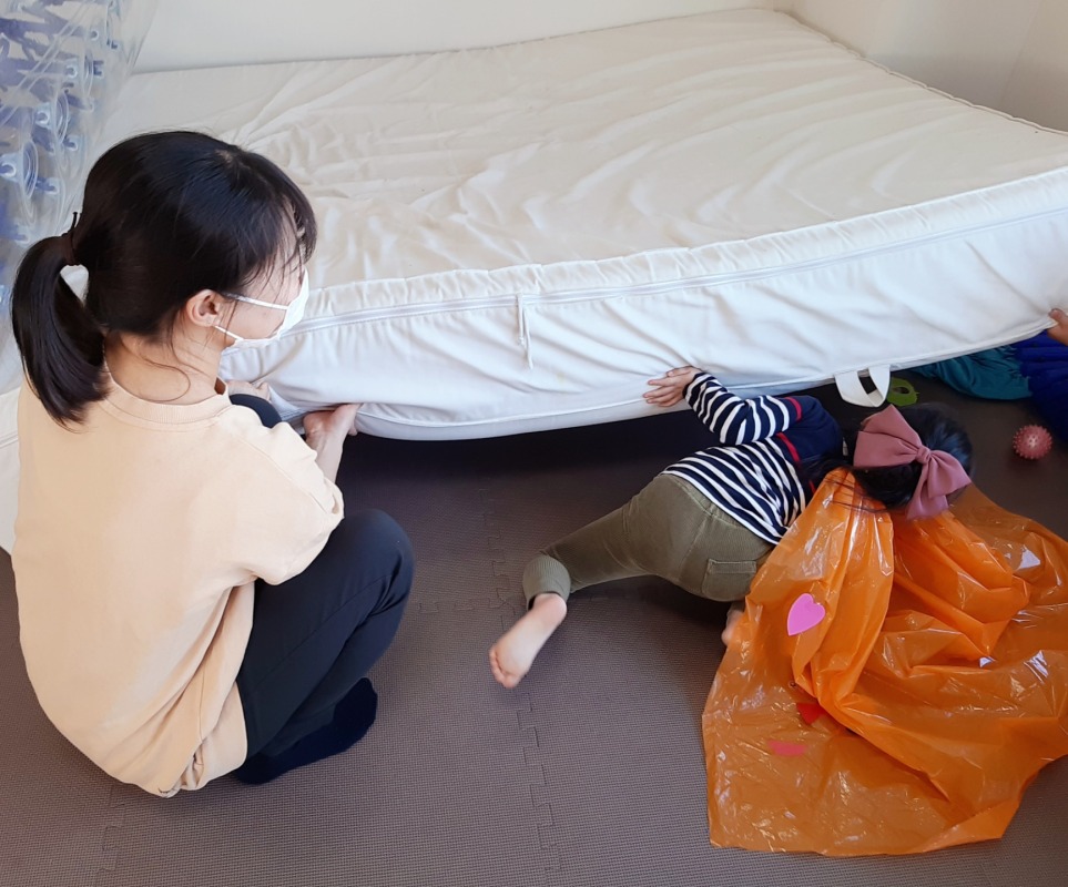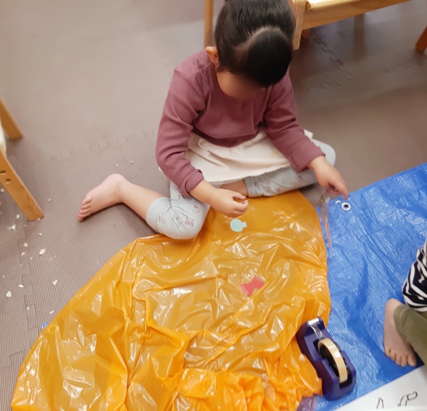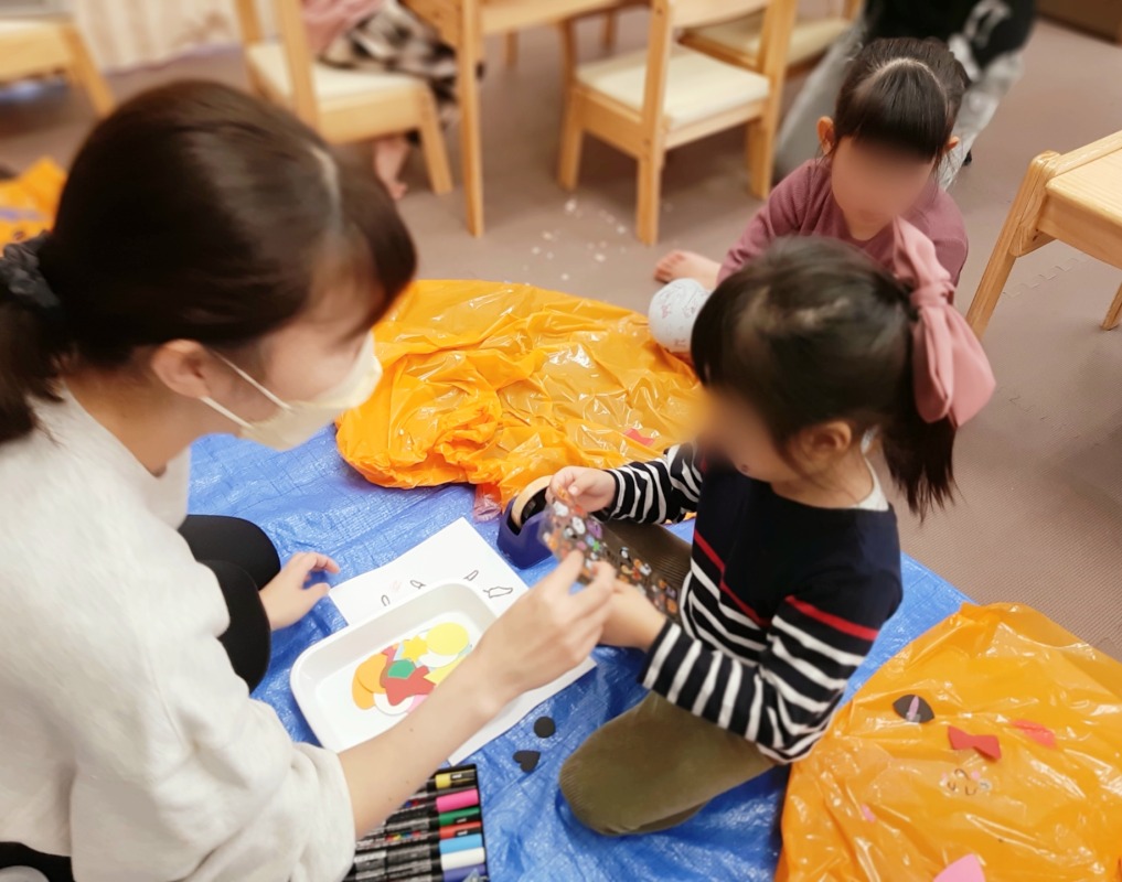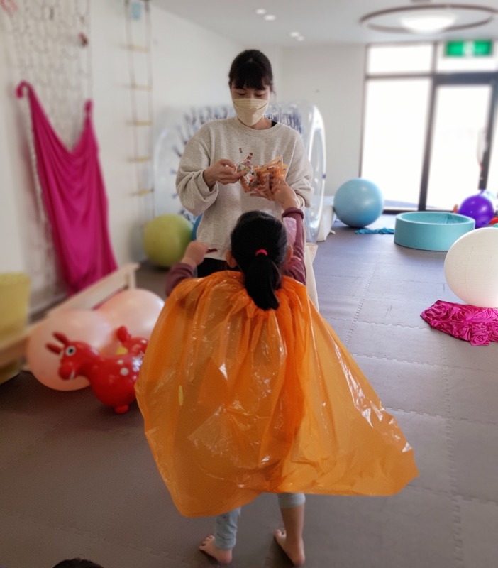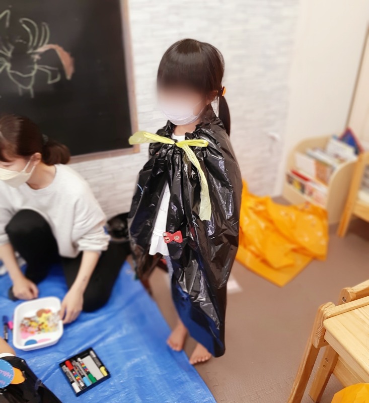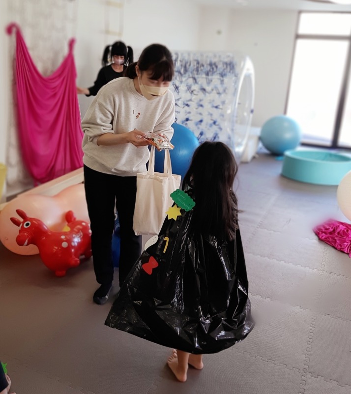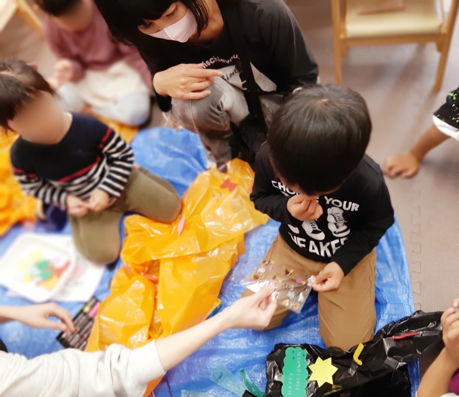 2022.10.29 きのね ハロウィンパーティー 日々のこと きのねハロウィンパーティー2022。まずはハロウィンの衣装づくり!シールやモールで飾り付けて、自分だけのステキなマントができあがりました!次は宝探し。プレイルームに隠された宝物を見つけます。みんな必死で探していました!見つけた時は大喜び!見つけた宝物を持って、「トリック・オア・トリート!」無事お菓子をゲットすることができました。