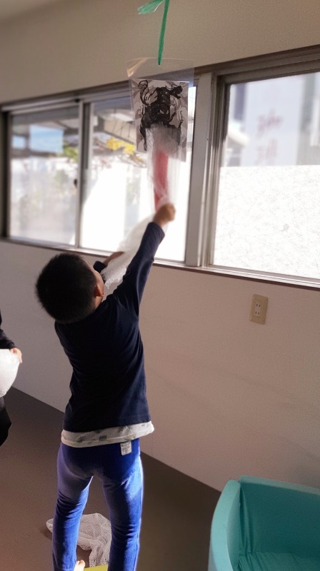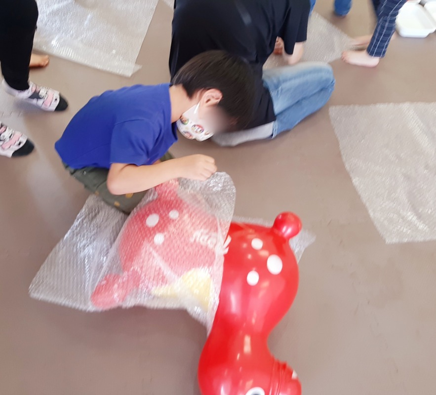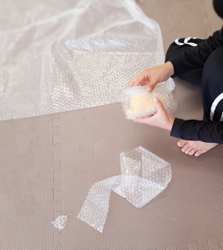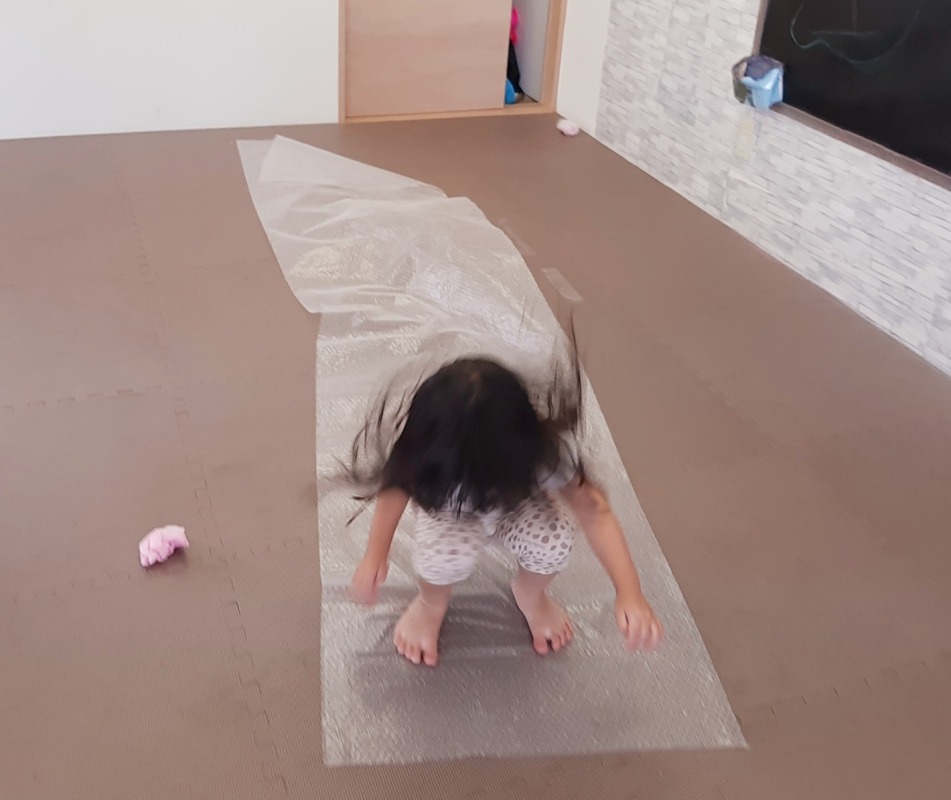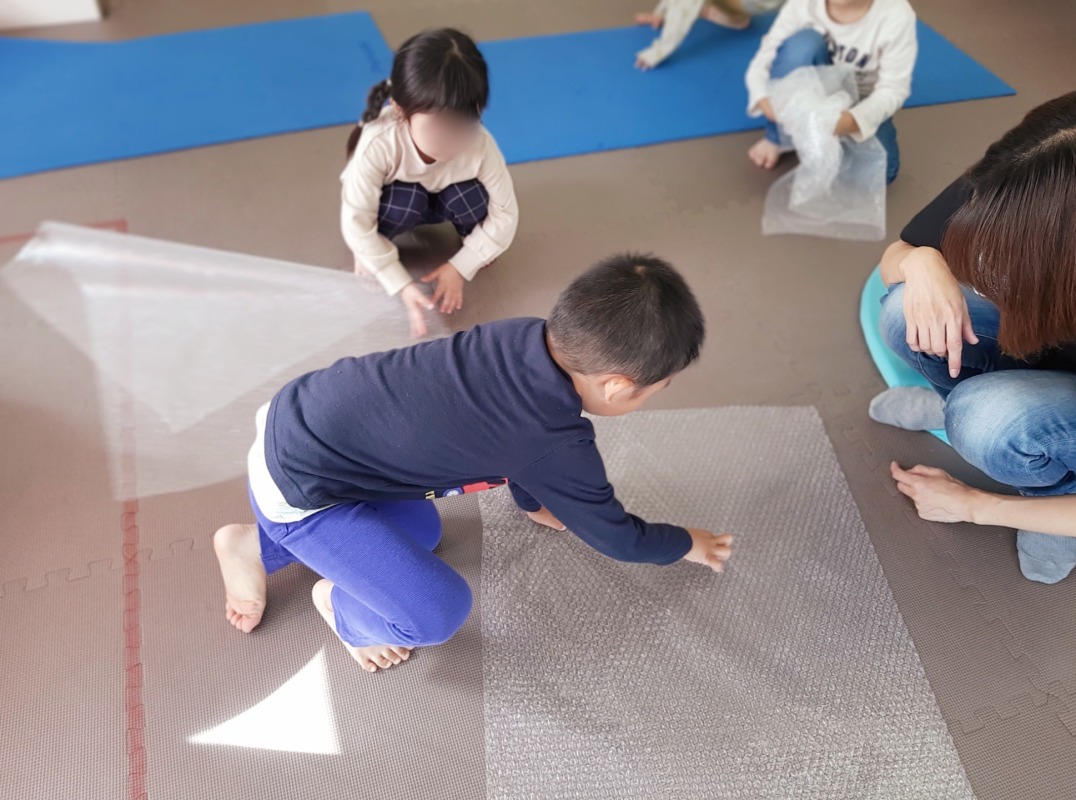 2022.11.3 きのね プチプチあそび 日々のこと 今日は、お馴染みのプチプチであそびました。プチプチ潰すのって、どうしてこんなに気持ちいいのかな?プチプチの上でおもいっきりジャンプ!プチプチ潰れる感触がおもしろいね。梱包しているのかな?丸めてボールを作ったり、剣を作ったりして、思い思いに楽しみました。