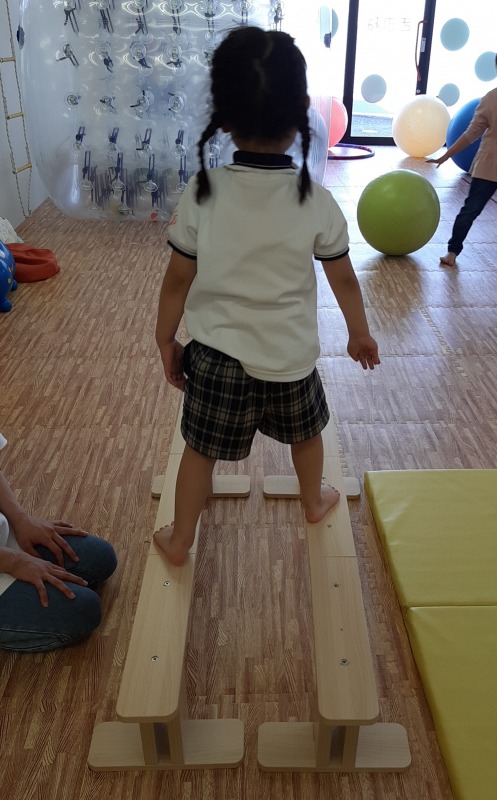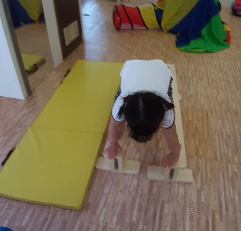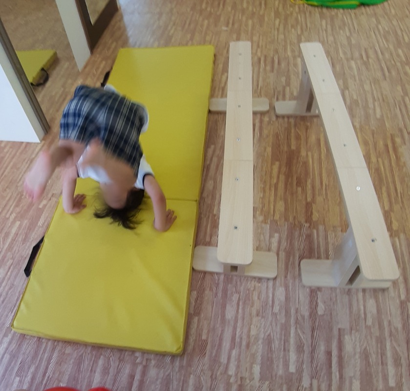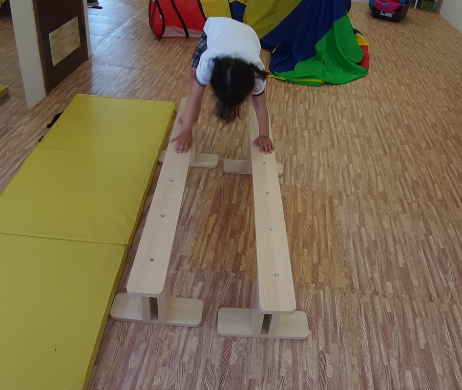 この、マットと平均台を使ったあそびは、「体操教室!」って言いながら、自分で始めました。