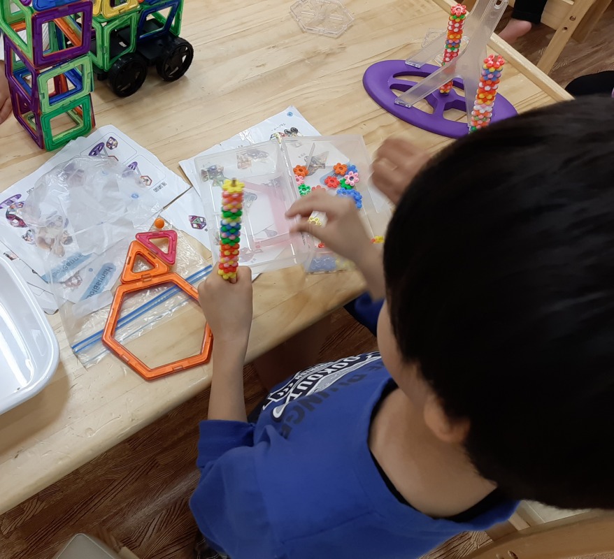 ひも通しをしたり、おままごとに使ってあそんでいるのをよく見かけましたが、今日はこんなあそび方をしていましたよ。