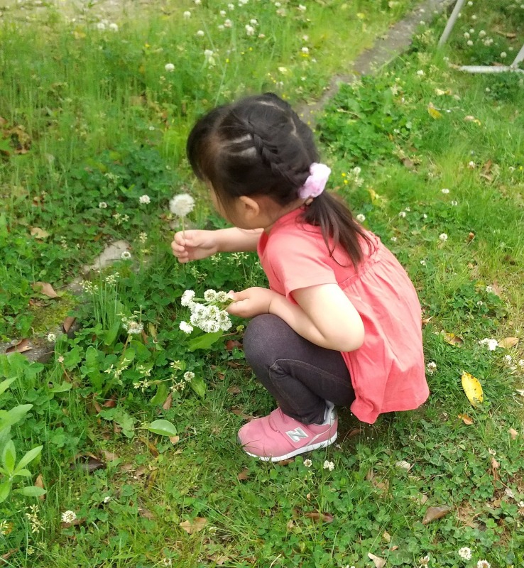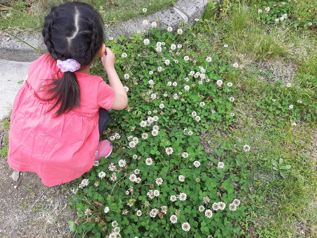 2021.5.9 シロツメクサ 日々のこと 公園に咲いてたシロツメクサ。たくさん摘みました。とってもごきげん。タンポポの綿毛も見つけました。自然のにおい、たくさん嗅いでいろんな感触確かめて笑顔もキラキラ輝いていましたよ。