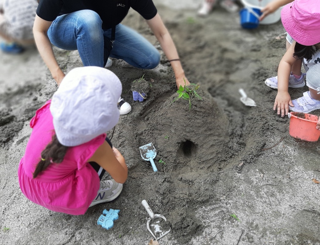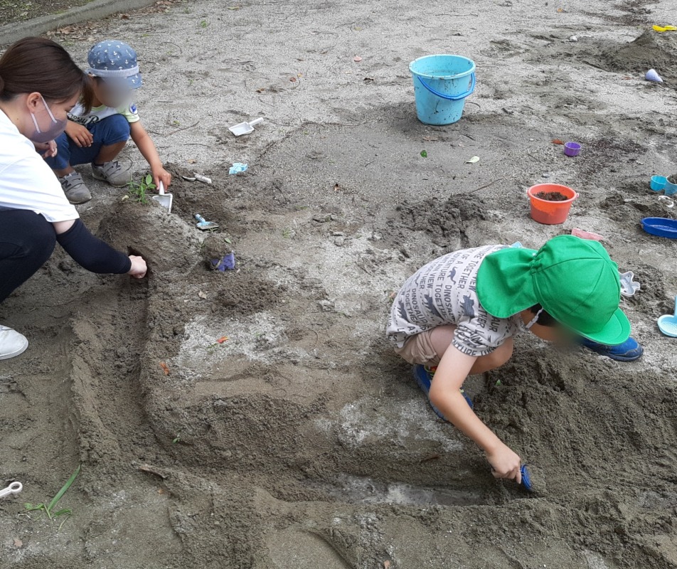 はじめは乗り気じゃなかったのに、友だちと一緒に始めたお山づくり。トンネル作って川と合体して、どんどんあそびが広がっていった子もいました!