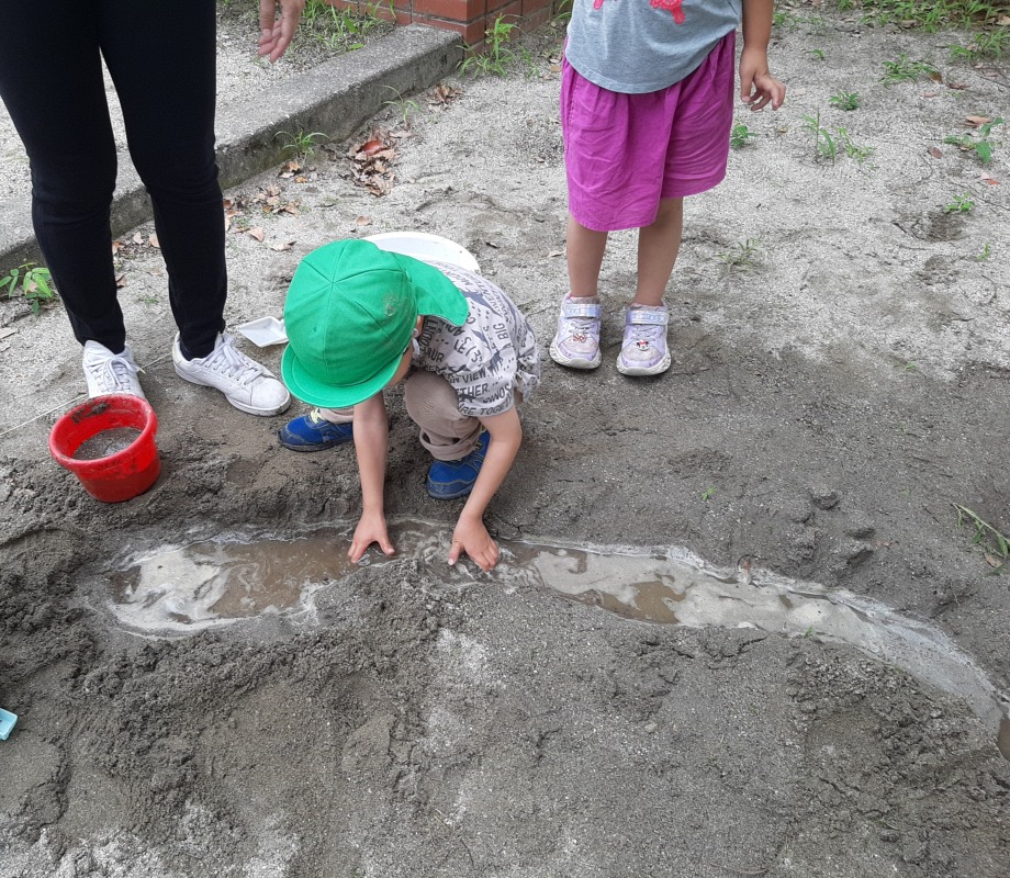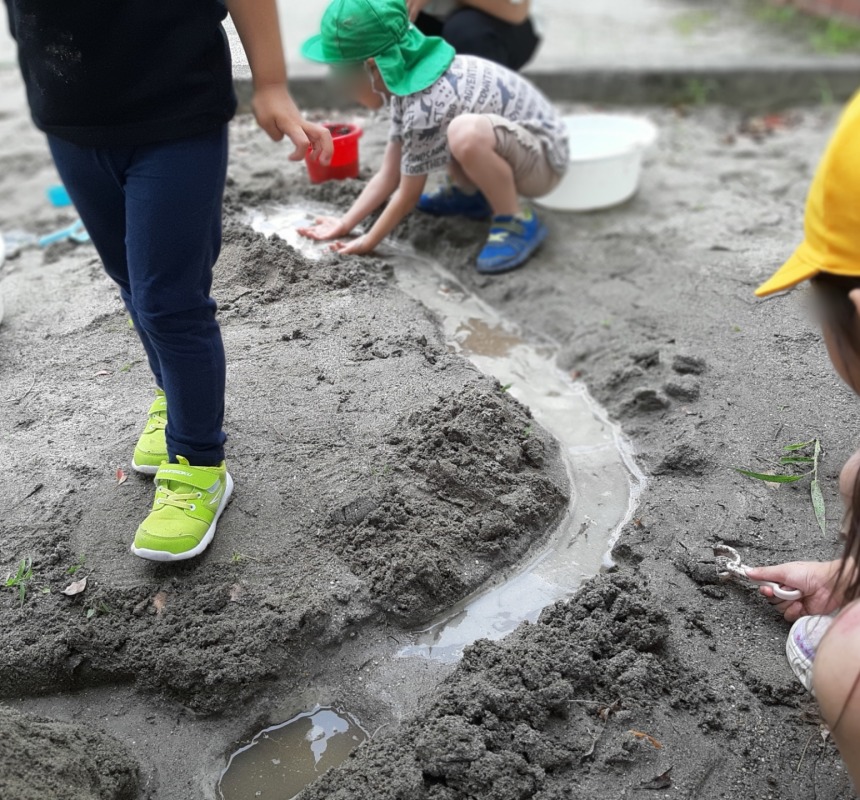 どろんこあそびのイメージ画像を見て、川を作るのを楽しみにしてきた子。